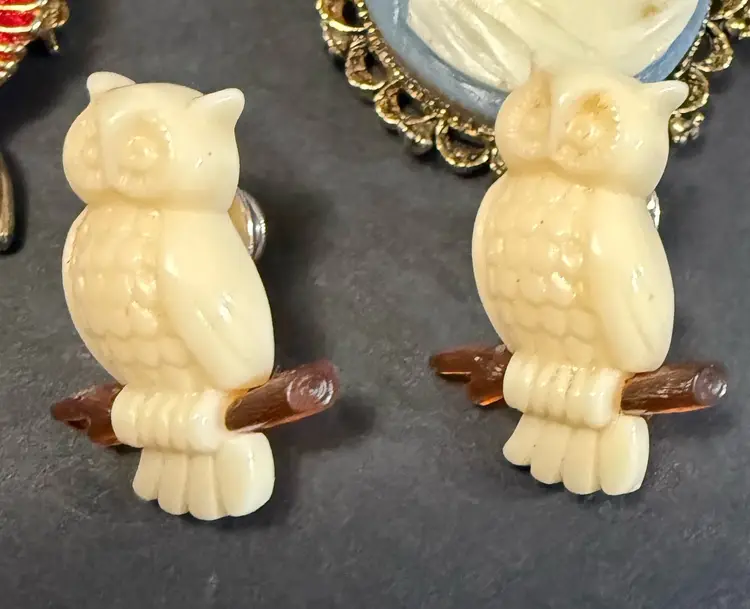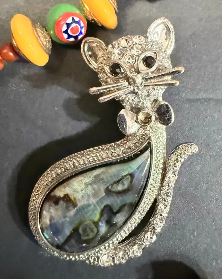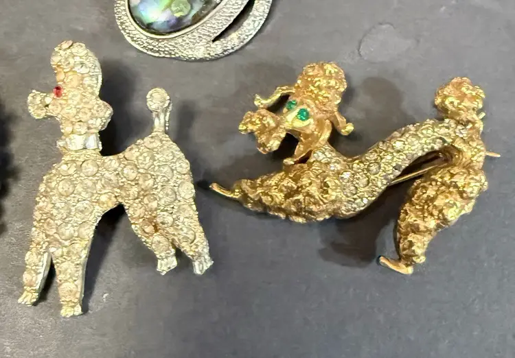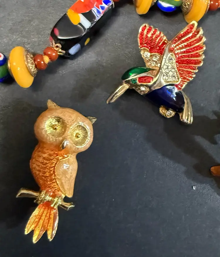 This vintage costume jewelry assortment includes 12 different pieces of pins and brooches, all featuring multicolor rhinestones set in assorted metals. The assortment offers a variety of designs and themes, perfect for any occasion. Each piece is unique and adds a touch of beauty to any outfit, making it a versatile and eye-catching addition to your jewelry collection.