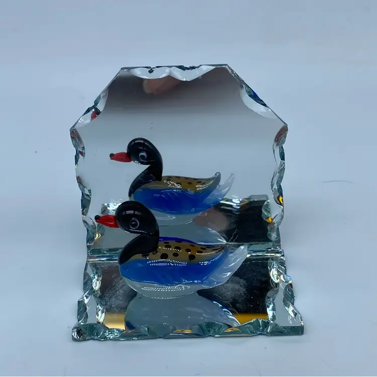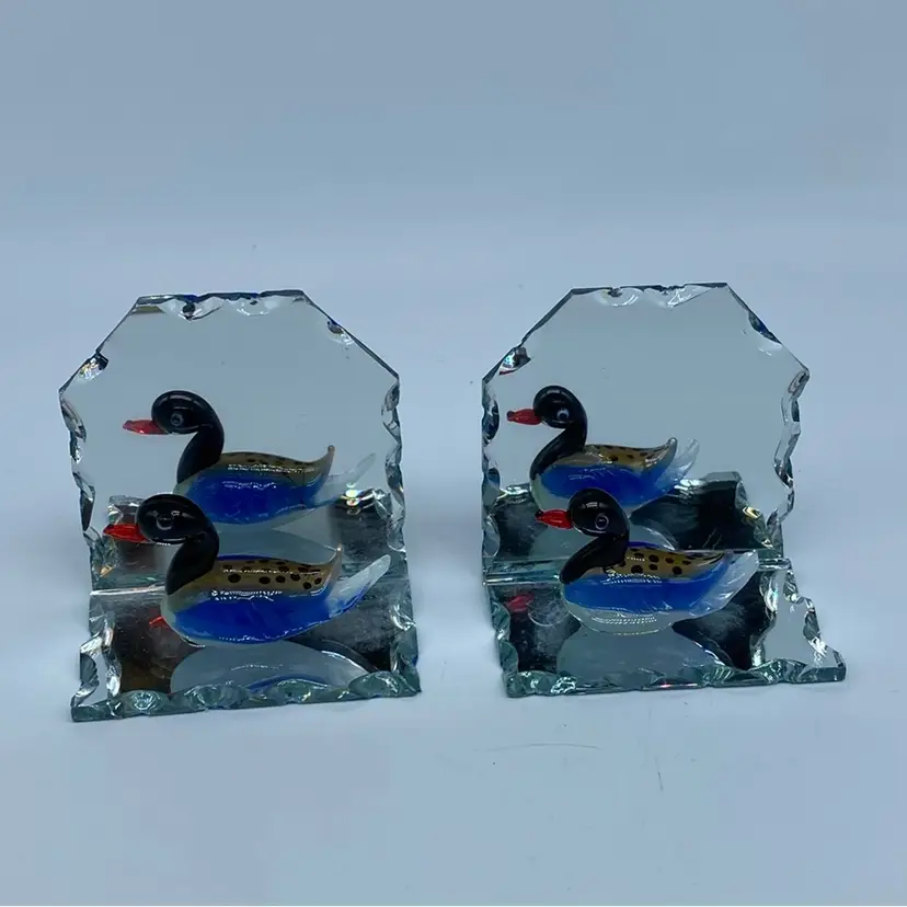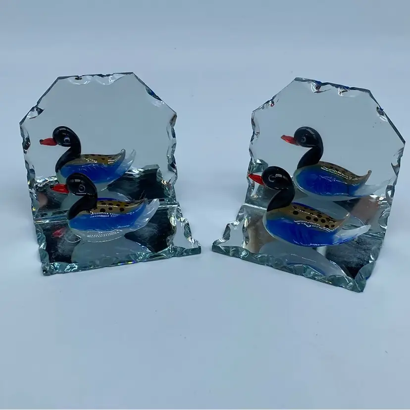 Bookends, while these may be too teeny to be functional, have also been a canvas for artistic expression throughout history. Combining the artistry of glassmaking with the shape of bookends, these pieces are decorative.The depiction of mallard ducks is a classic motif in decorative arts, often associated with nature, tranquility, and the outdoors, making them a popular subject for collectible items.