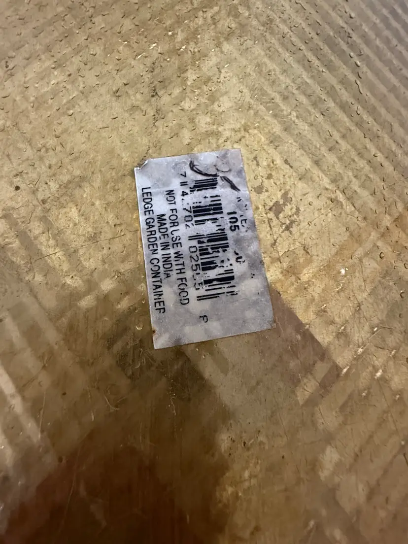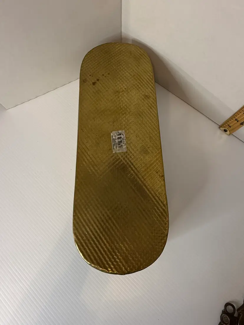 Vintage hammered brass planter tray. Measures 16” long by 4” deep. Elongated oval form with a hammered texture and rolled rim. Great patina and character. Ideal for kitchen herbs, bathroom storage, desk organization, pillar candles, tabletop décor. There is a small dent toward the bottom on one side as seen in the picture