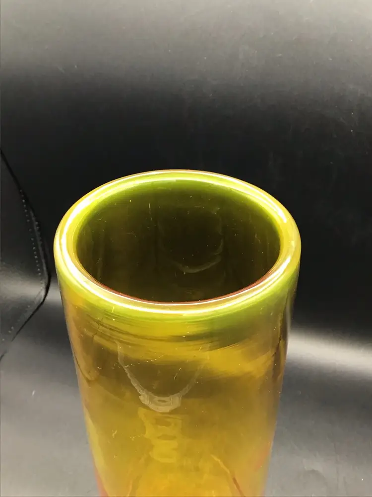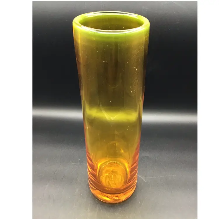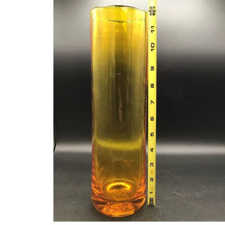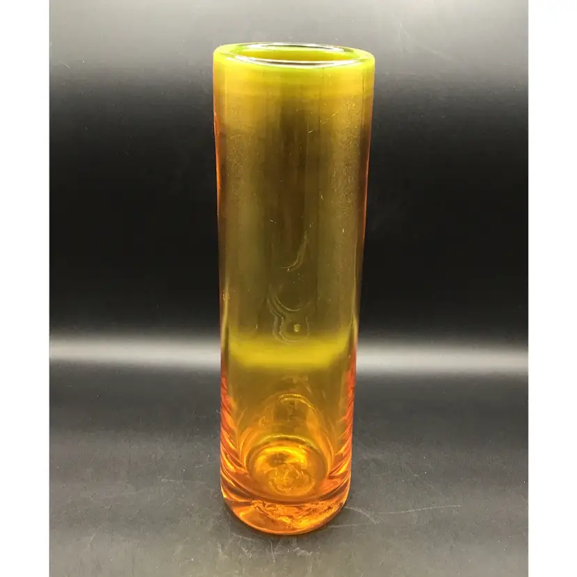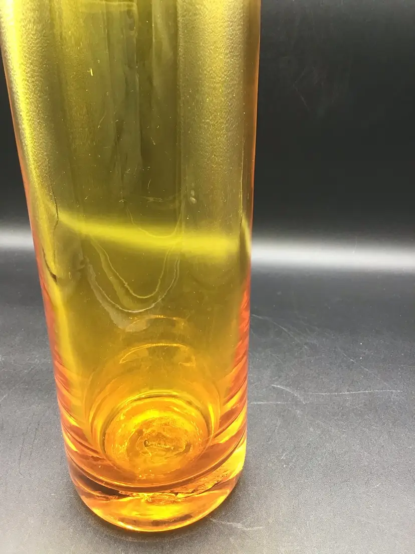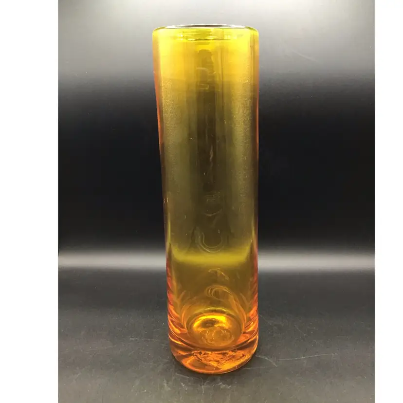 This gorgeous cylinder vase is approximately 12 inches tall and has a color gradient of orange to gold. The vase is attributed to Blenko and does glow under black light. There are some surface scratches and a small scuff mark on the vase as shown in the pictures. The pontil is unpolished. Please see pictures with the description, measurements and condition.