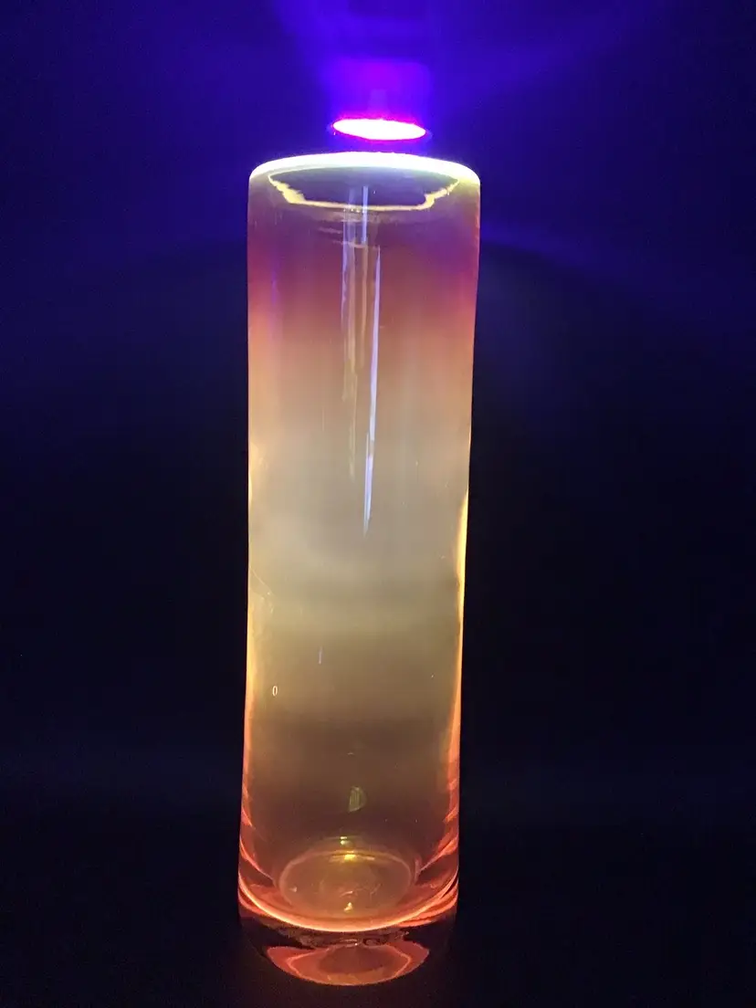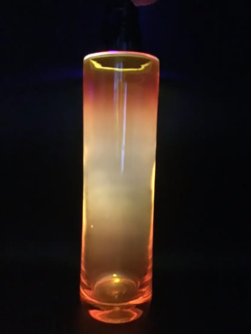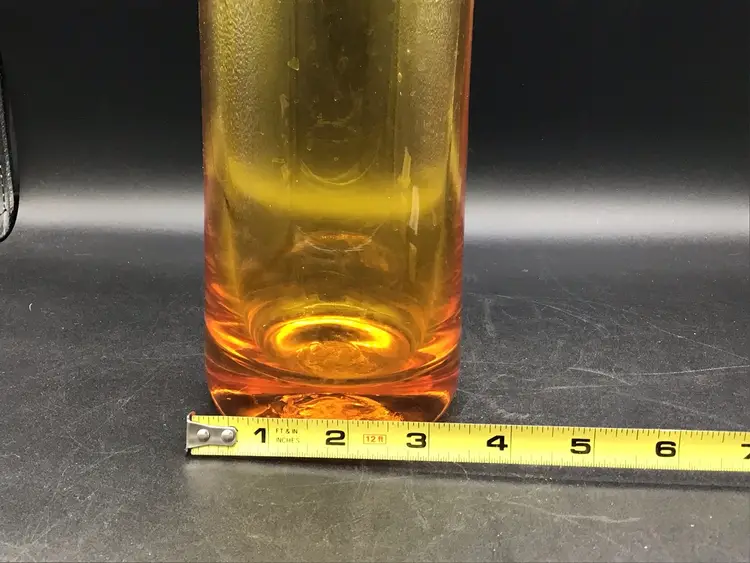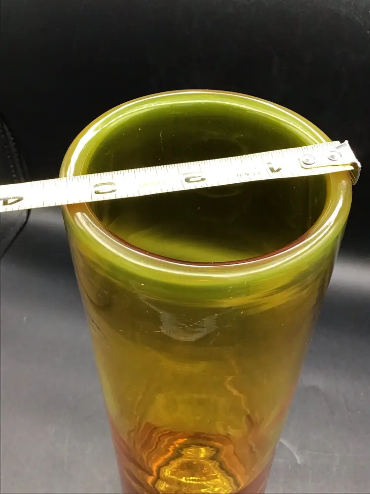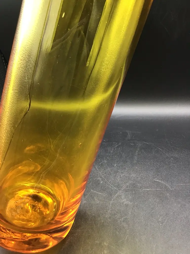 This gorgeous cylinder vase is approximately 12 inches tall and has a color gradient of orange to gold. The vase is attributed to Blenko and does glow under black light. There are some surface scratches and a small scuff mark on the vase as shown in the pictures. The pontil is unpolished. Please see pictures with the description, measurements and condition.