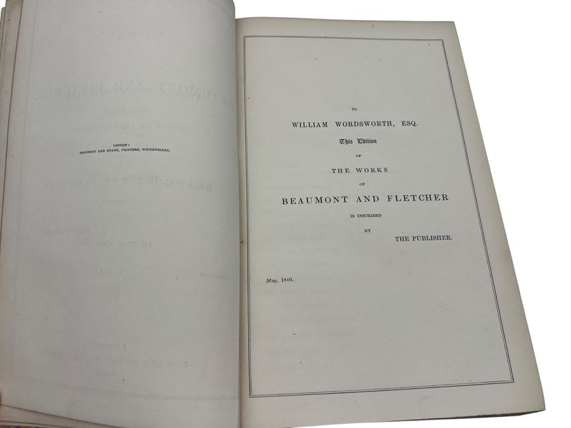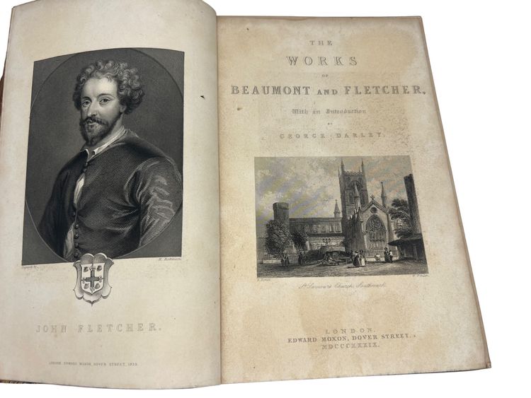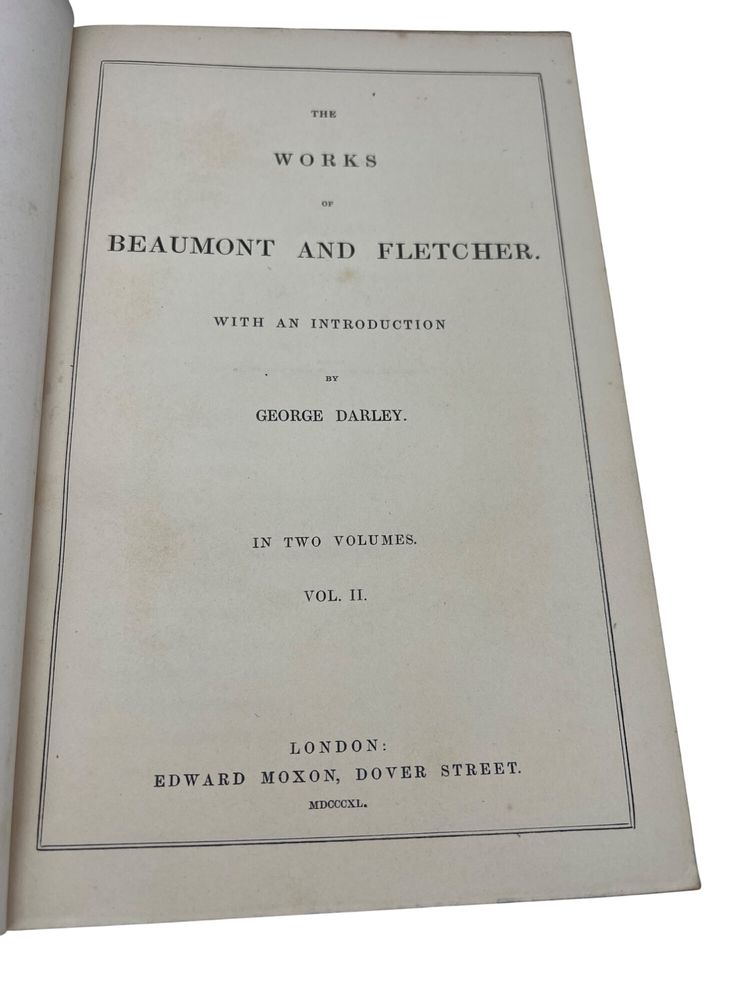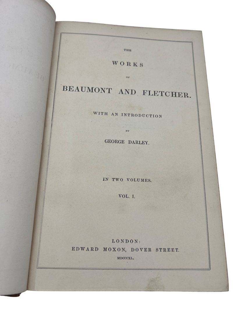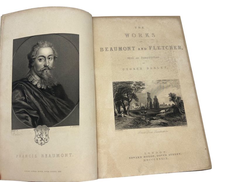 Two-volume 1840 Edward Moxon edition of The Works of Beaumont and Fletcher (intro. George Darley). Octavo, each about 9.5" x 6". Leather bound with gilt spines and red labels; marbled edges and endpapers; engraved portrait frontispieces and engraved general titles (dated 1839), with printed volume title pages 1840. Classic collected plays of the Jacobean collaborators—attractive shelf presence and a nice Victorian printing.