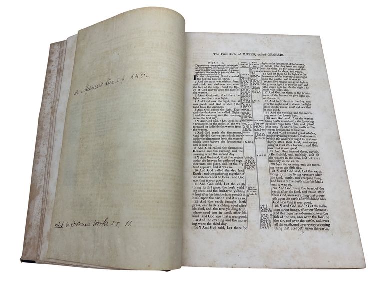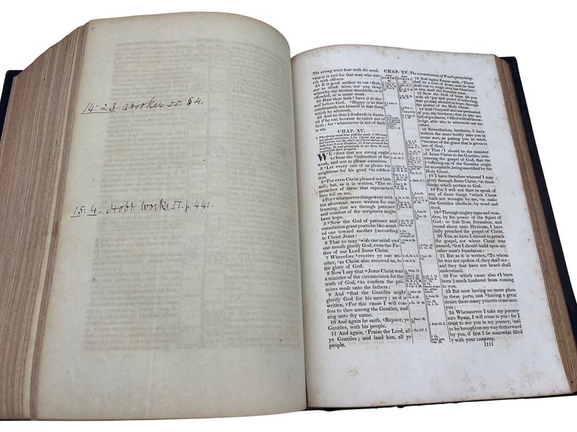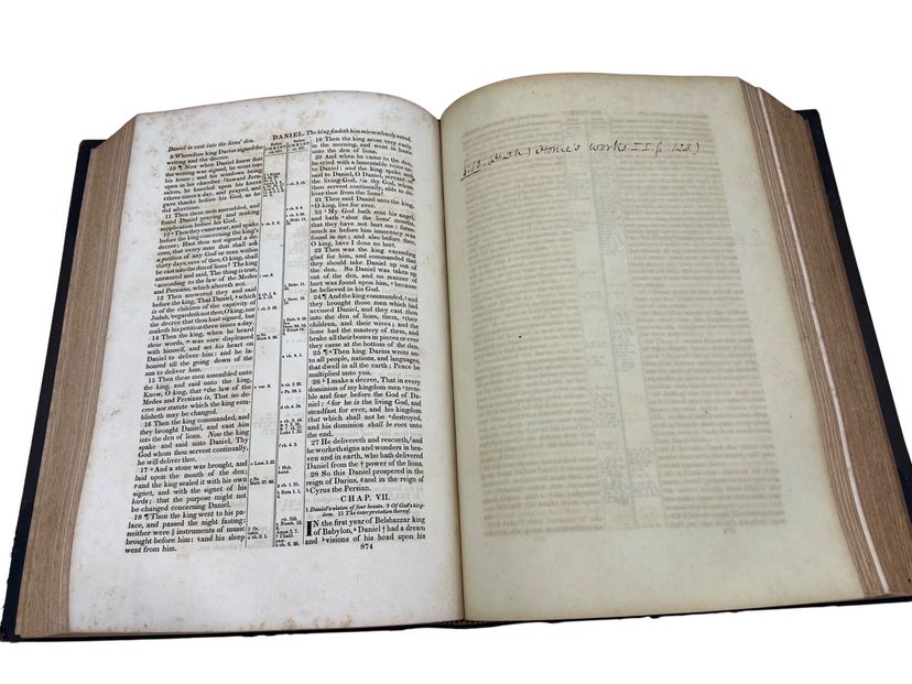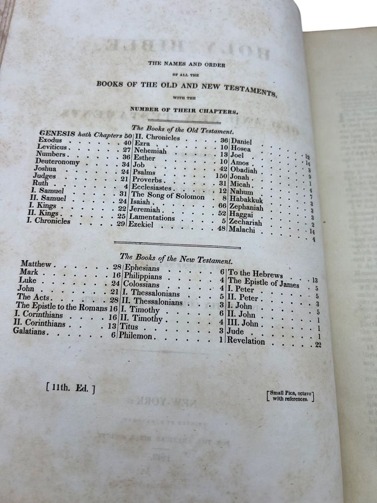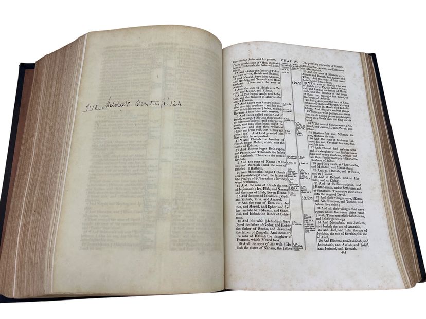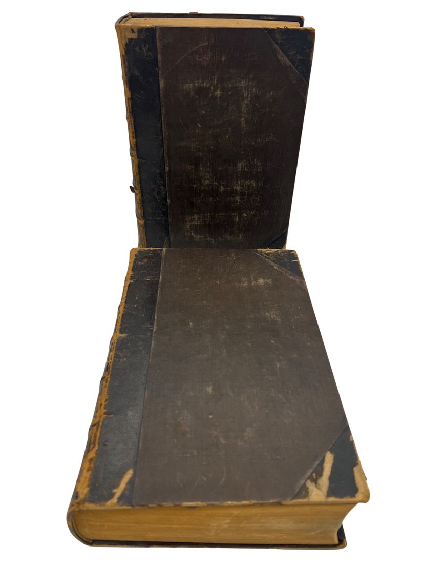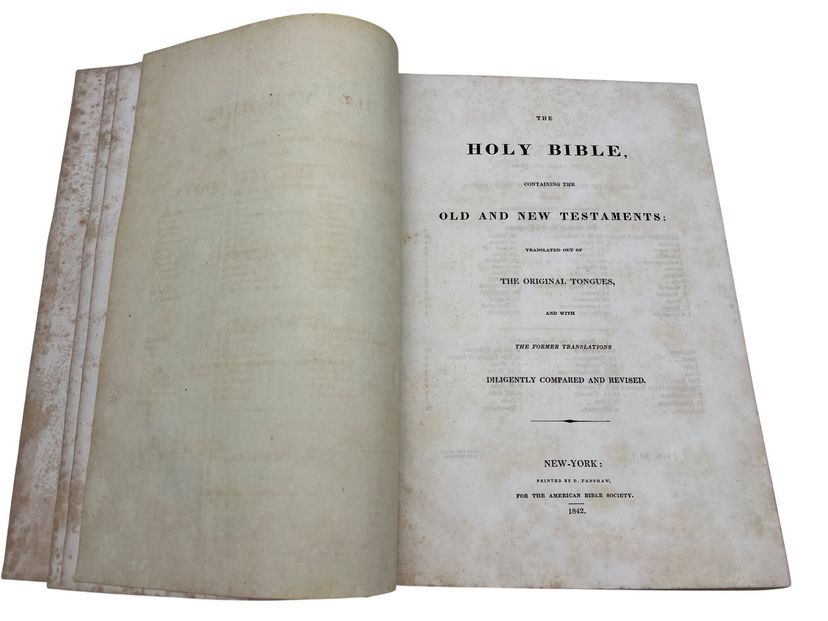 Two-volume American Bible Society Reference Bible (KJV), 1842, printed by D. Fanshaw. ABS Small Pica octavo with center-column references; Vol. I covers Genesis–Psalm LXXII, Vol. II Psalm LXXIII–Revelation (no separate title page, as bound). Period half-leather over cloth, gilt spines. Approx. 10.75" × 7.25"; each vol. ~2.75" thick. A substantial mid-19th-century pre-Civil War ABS reference set.