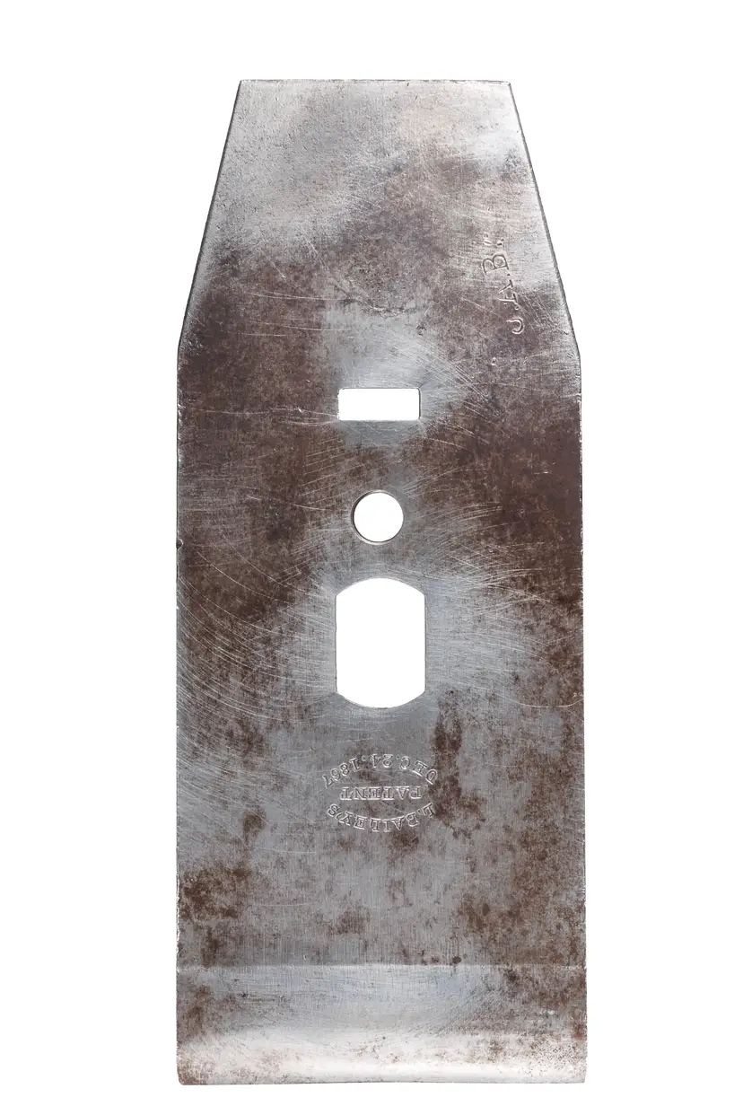 This is an original replacement Stanley plane cap iron (chip breaker). It is 2-3/8" wide, which works with hand plane No's 4-1/2, 6, & 7. It is the earlier style with Bailey's 1867 patent stamp. It does have some cosmetic defects, but works as it should.