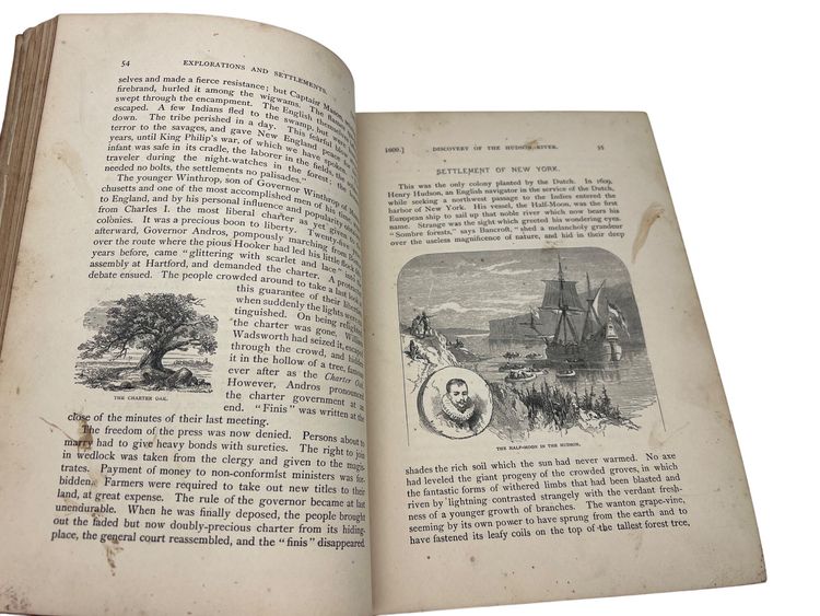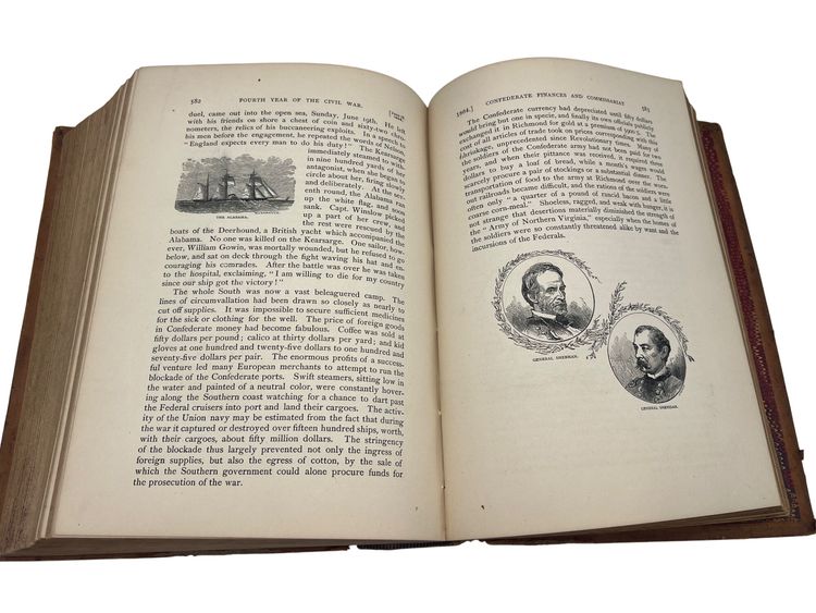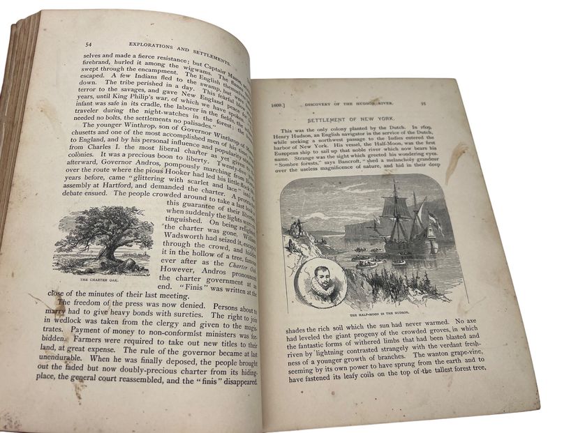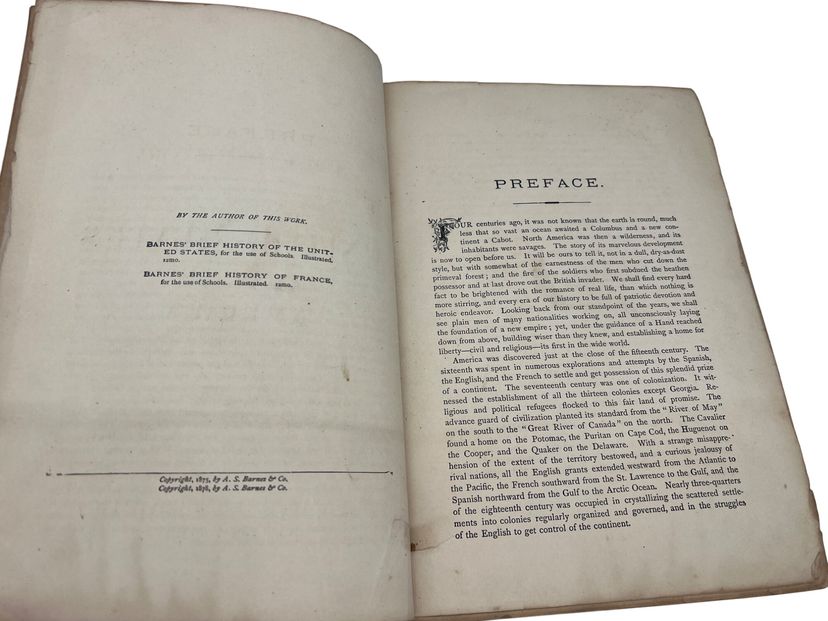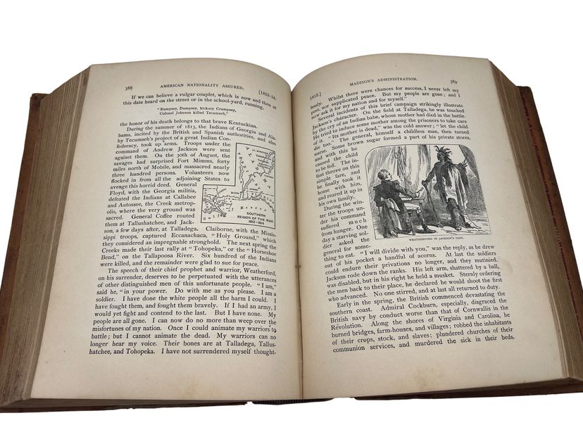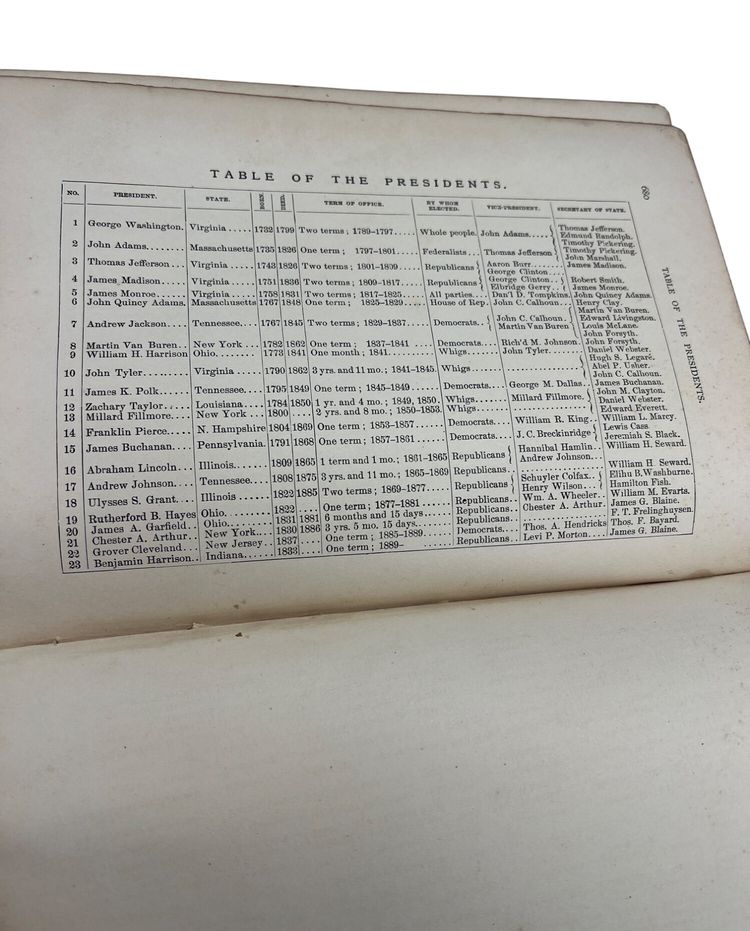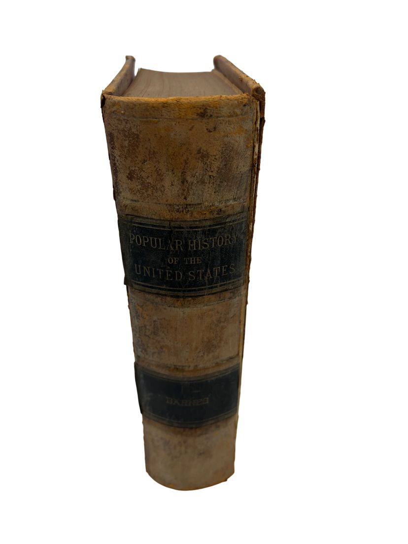 Illustrated 19th-century U.S. history text by Joel Dorman Steele, published by A.S. Barnes & Co. Full leather with marbled endpapers, 680 pages, numerous images and a Washington frontispiece. Copyright page lists 1878, but this issue carries the presidents table through Benjamin Harrison, reflecting a later updated printing. Measures approx. 9.5" × 6.75".