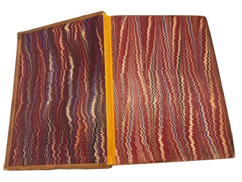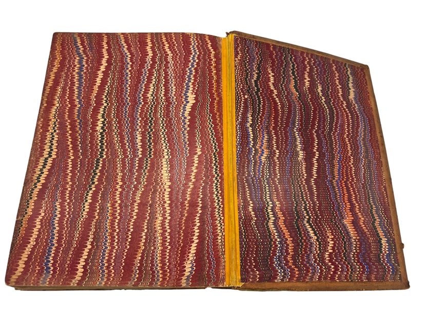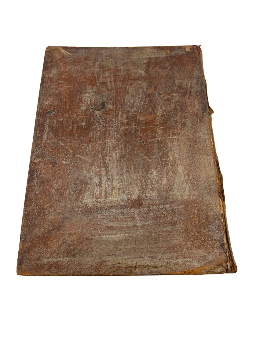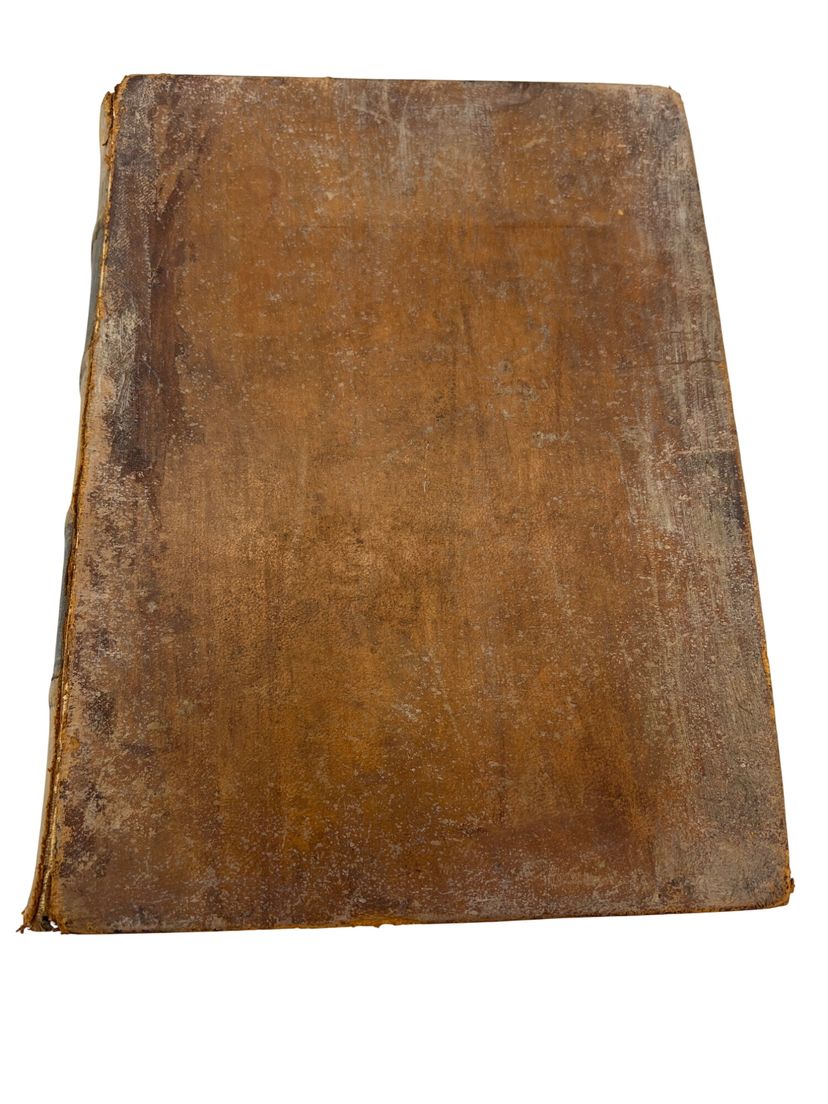 Rubbed and worn leather, edge wear, hinges reinforced, foxing and a moisture stain at frontis, scattered smudges; pages complete and legible. See pictures for further details on condition.