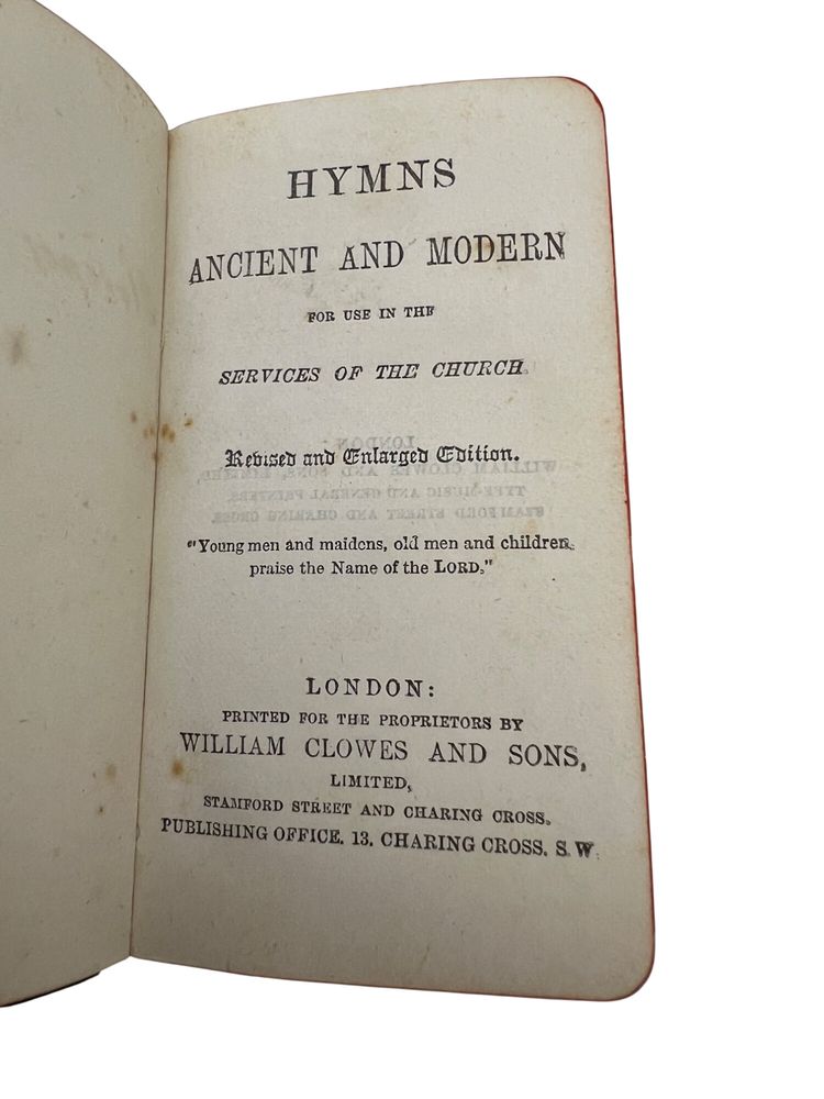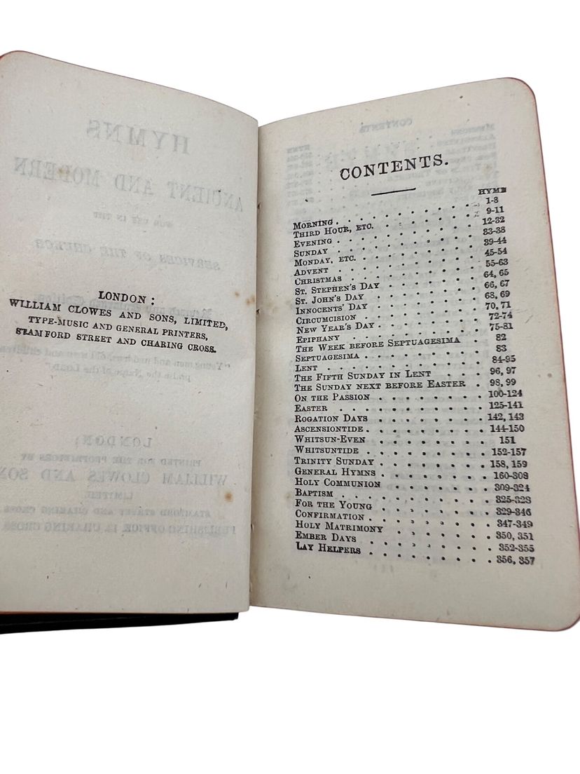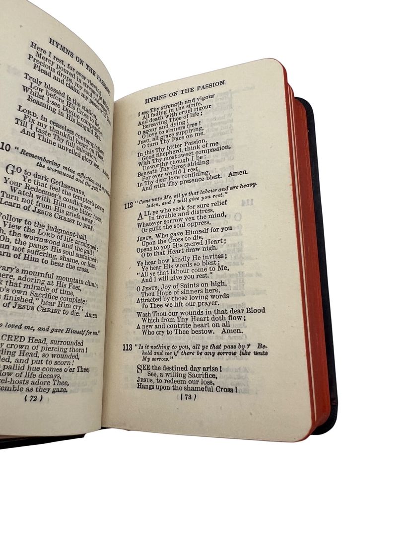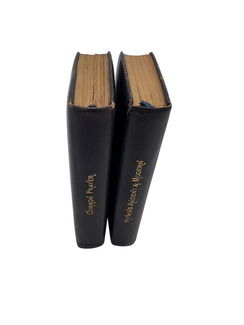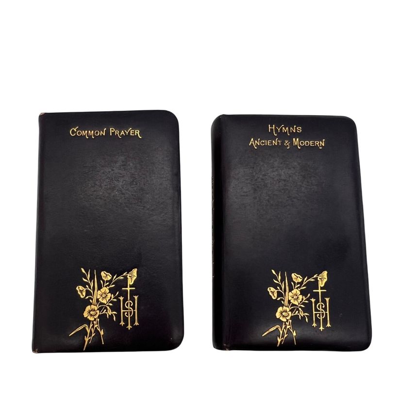 Matched Victorian miniature worship set, each ~3.75" x 2.5". The Book of Common Prayer (Oxford for Griffith, Farran & Co., “Diamond 48’s,” “Cum Privilegio”) and Hymns Ancient & Modern (Revised & Enlarged; William Clowes & Sons). Flexible black leather with gilt floral IHS to fronts, red edges, and blue ribbon markers. Both carry gift inscriptions dated Christmas 1887. Great Anglican/ephemera shelf appeal.