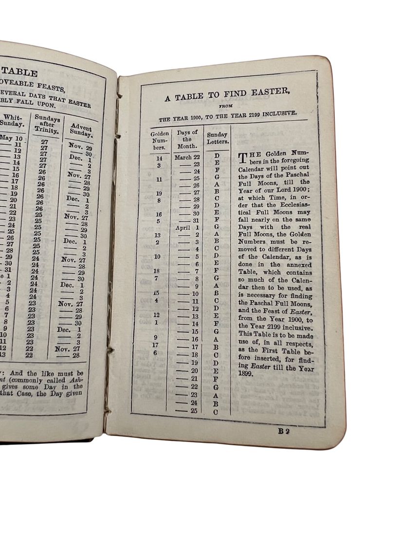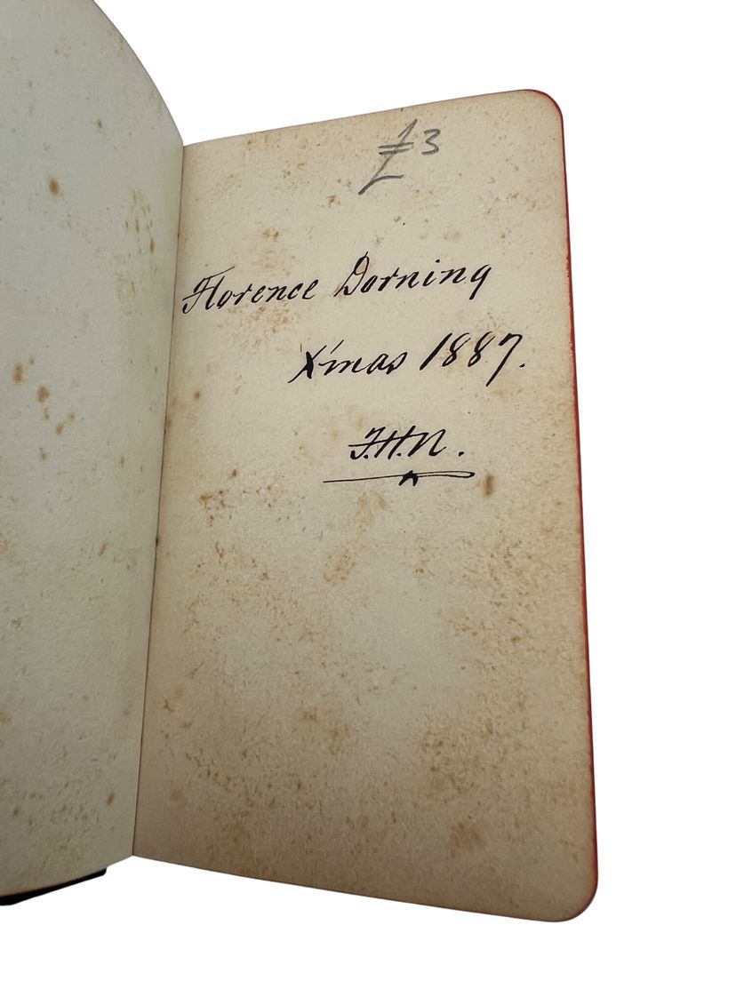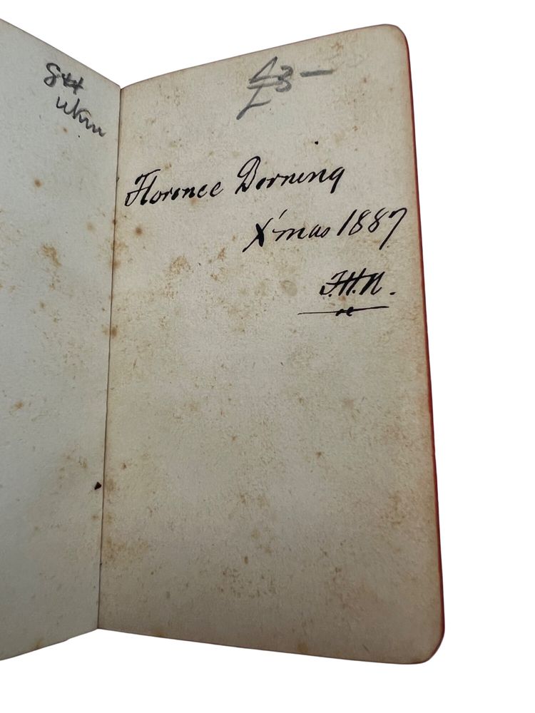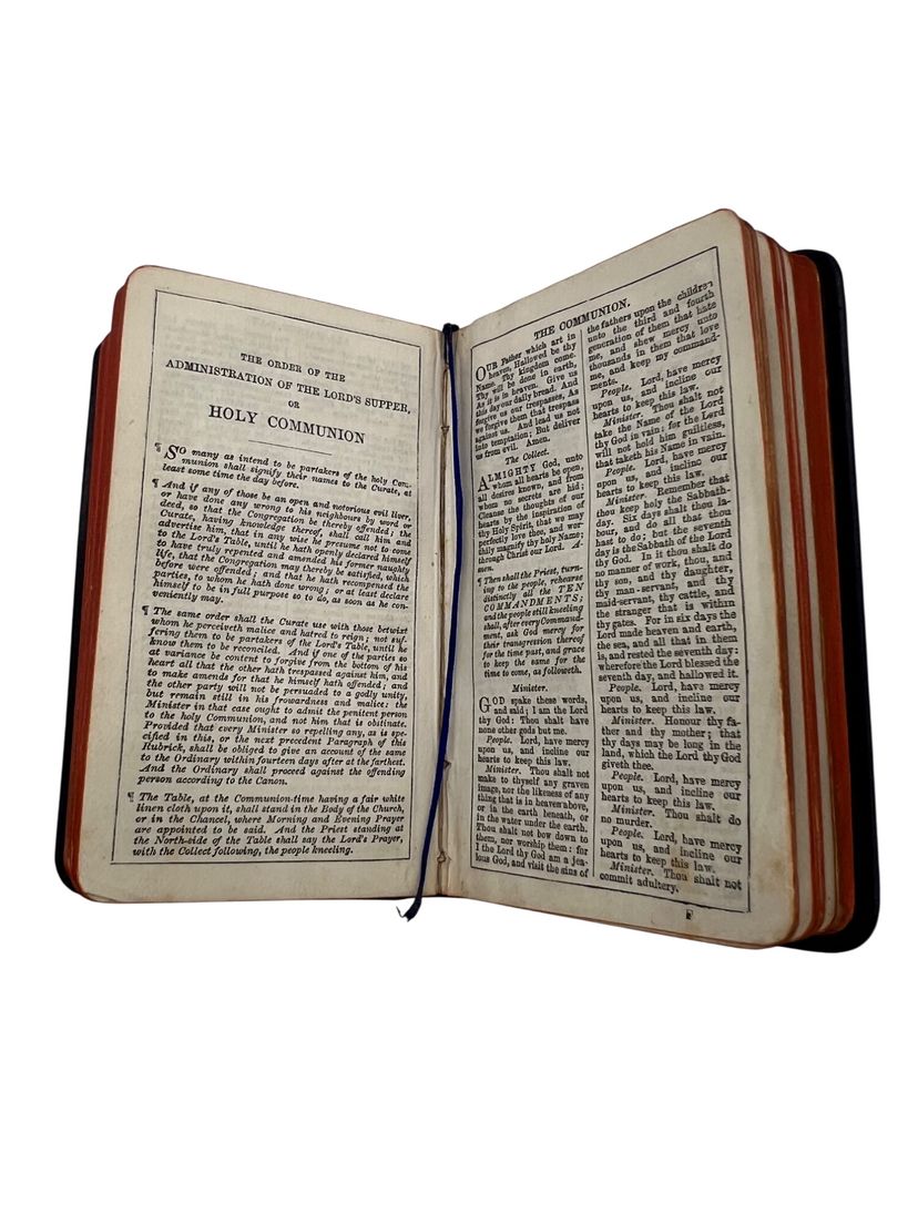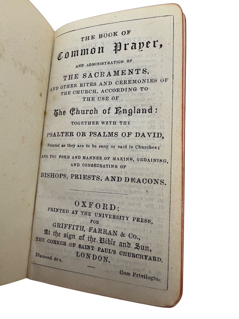 Matched Victorian miniature worship set, each ~3.75" x 2.5". The Book of Common Prayer (Oxford for Griffith, Farran & Co., “Diamond 48’s,” “Cum Privilegio”) and Hymns Ancient & Modern (Revised & Enlarged; William Clowes & Sons). Flexible black leather with gilt floral IHS to fronts, red edges, and blue ribbon markers. Both carry gift inscriptions dated Christmas 1887. Great Anglican/ephemera shelf appeal.