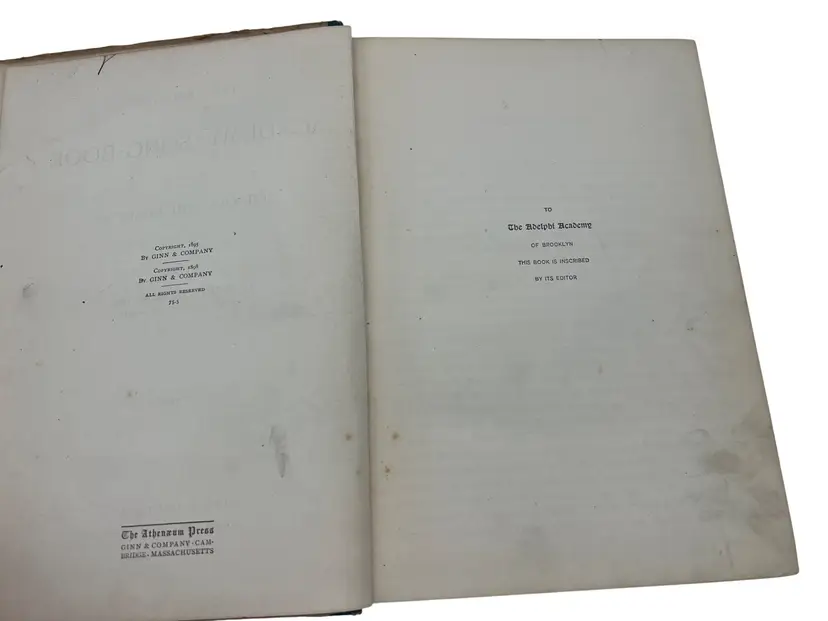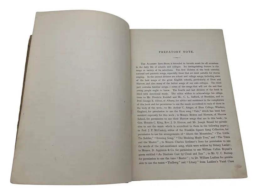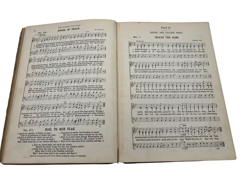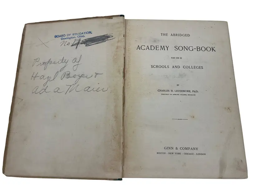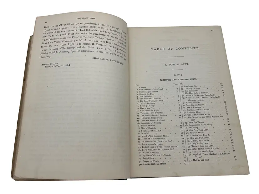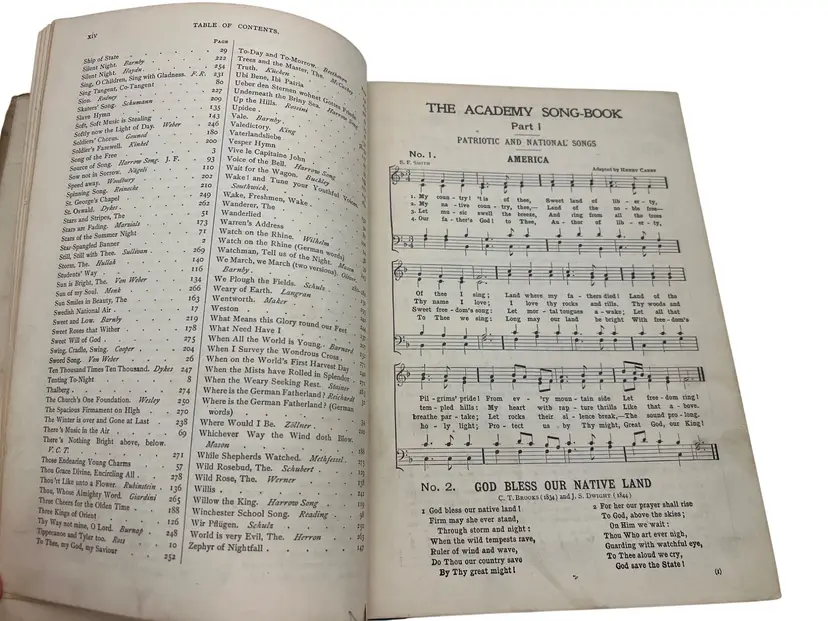 Classic late-19th-century school songbook compiled by Charles H. Levermore and published by Ginn & Co. in 1898. Hardcover, 298 pages, with sections for patriotic/national songs, school and college songs, familiar pieces, and devotional music. Includes staples like “America,” “God Bless Our Native Land,” and “The Star-Spangled Banner.” Great reference or display for music-education history.