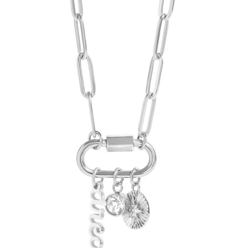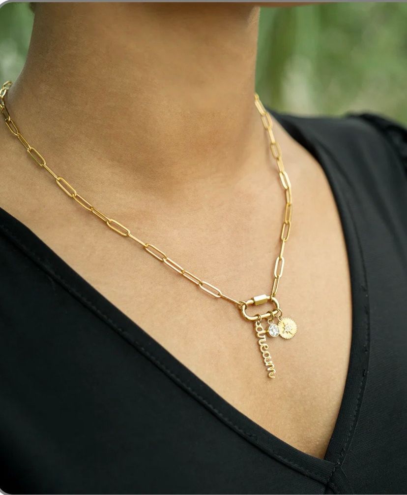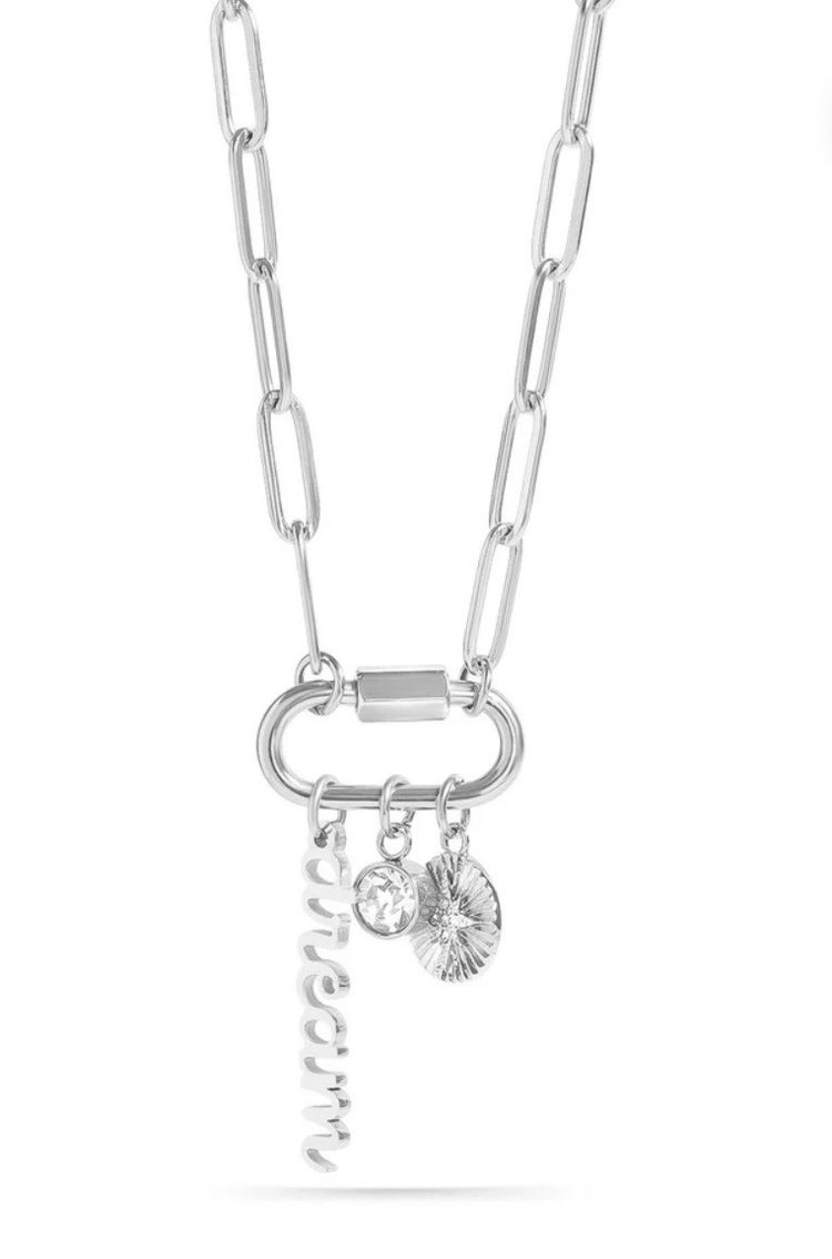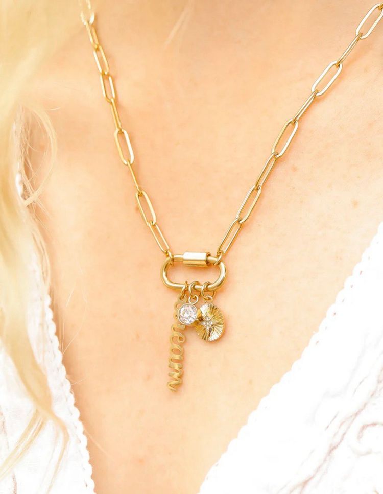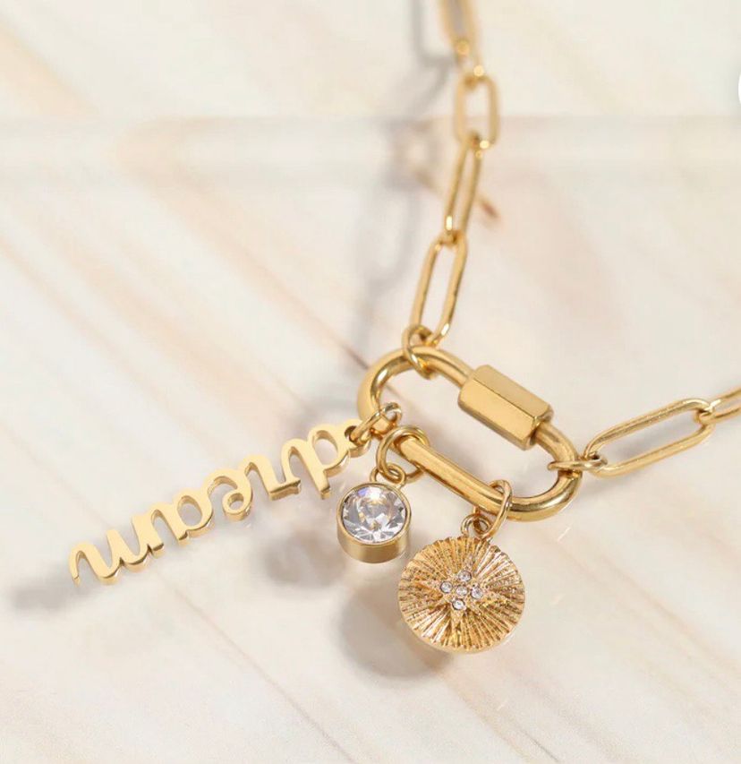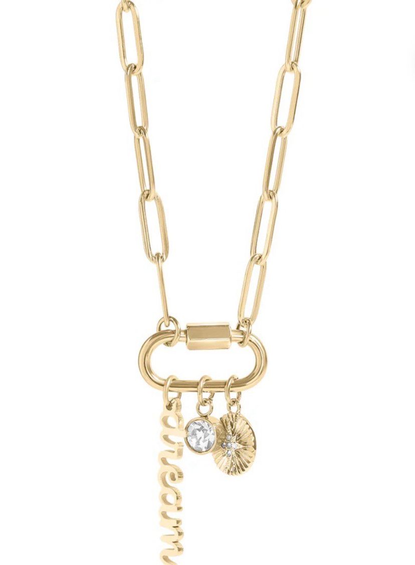 Stainless Steel Dream Charms on a Carabiner Charm Keeper. The charm keeper is featured on an 18" paperclip chain. This charm necklace includes a dream script charm, a bezel set clear stone, and a sunburst North Star Compass charm with a clear stone at the center. The carabiner charm keeper is functional so you can add or take off charms to create your own look. Available in both Stainless Steel and 18K Gold over.