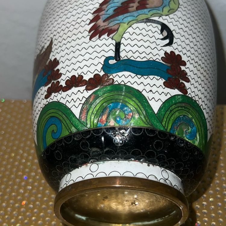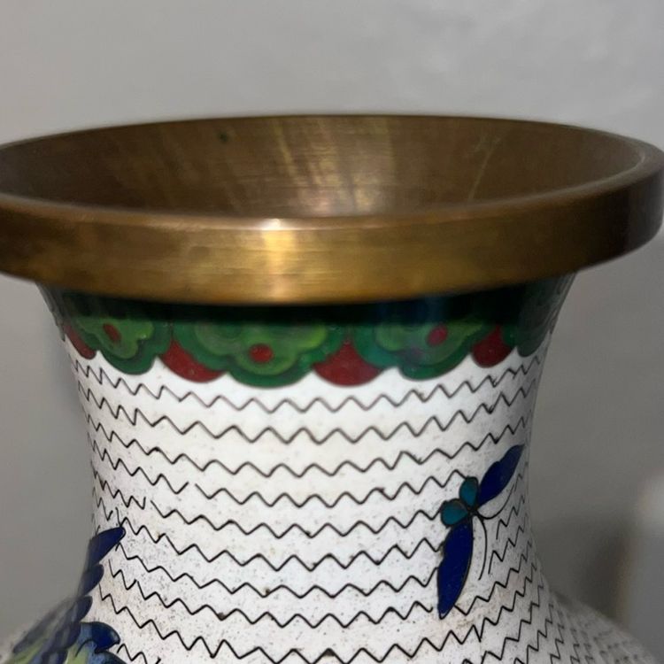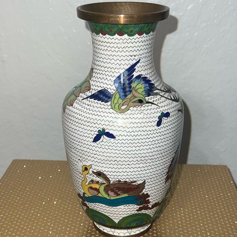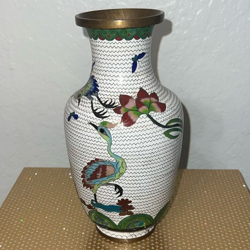 This type of vase features floral designs, such as lotus flower and other items in Asian art. The vase stands 8.5" tall and is made of copper, copper alloys, and vitreous glass enamel.