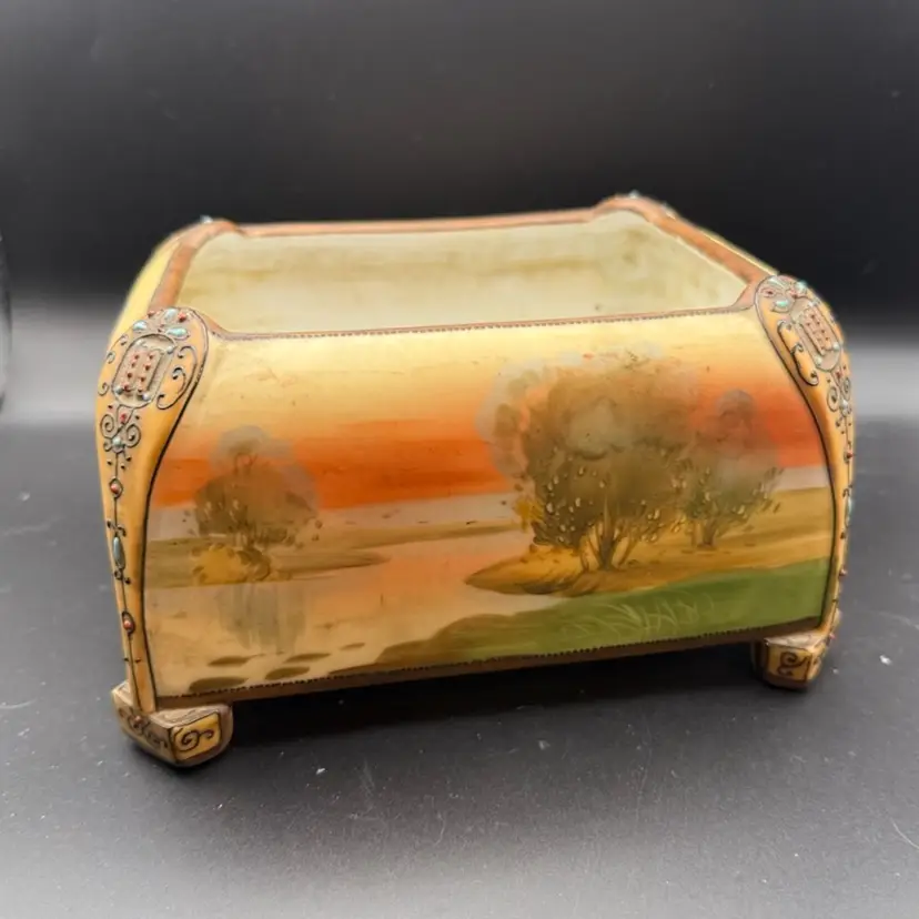 This ferner or planter is from Japan likely from the Morimura Brothers (Noritake) Company, circa 1910, indicated by the "Nippon" mark used for export between 1891 and 1921. Features a hand-painted landscape scene with trees and a body of water, and decorative elements on the corners.