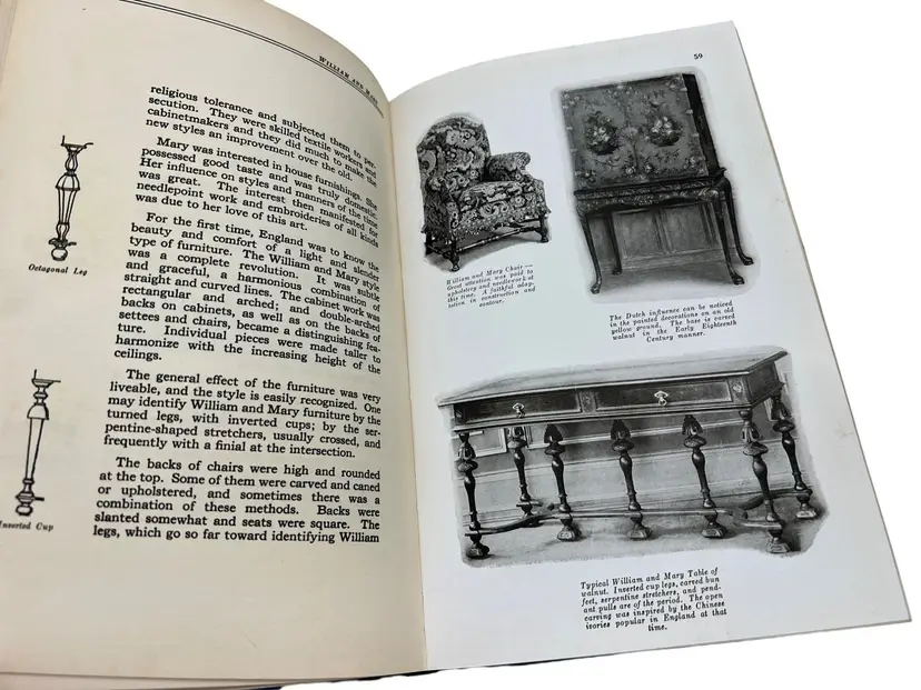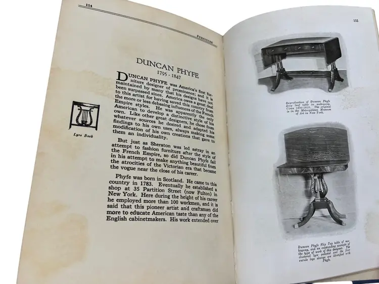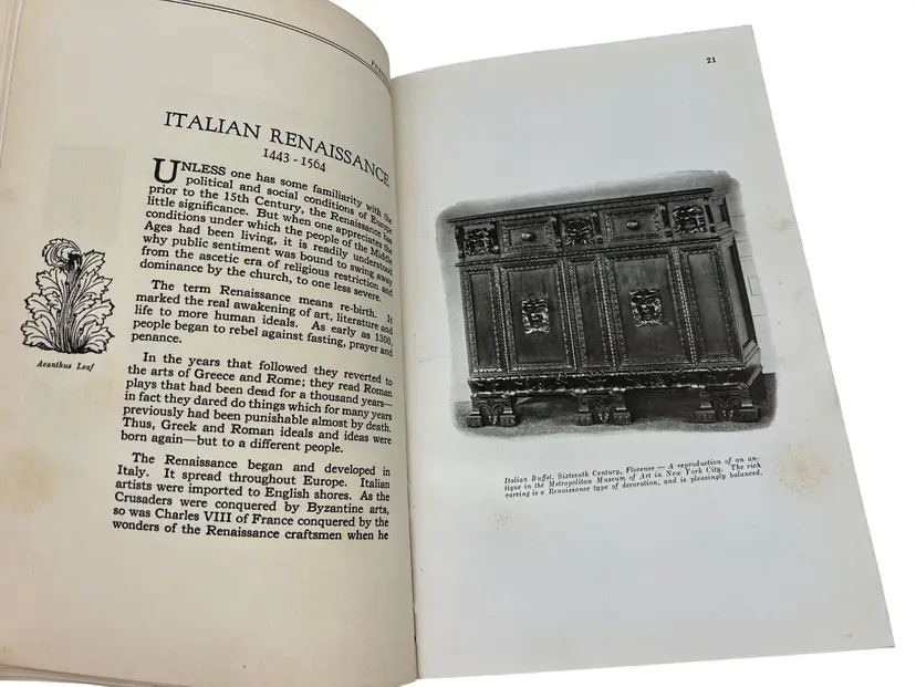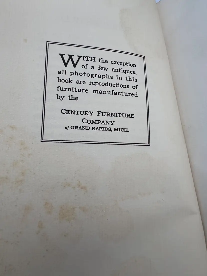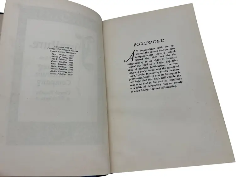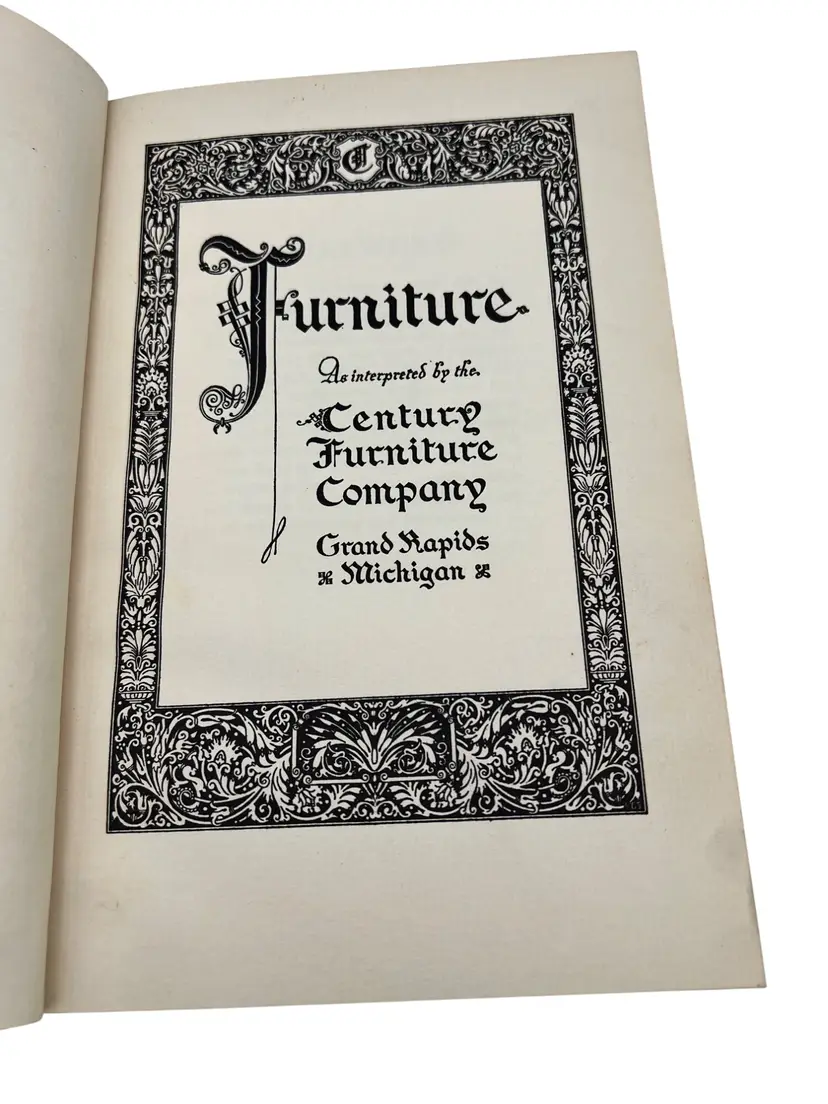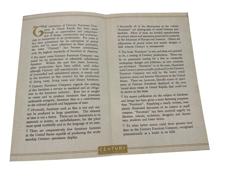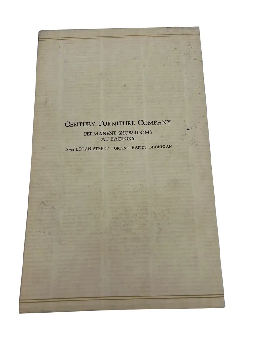 “Furniture: As Interpreted by the Century Furniture Company,” ninth printing from 1939, is the Grand Rapids maker’s illustrated survey of period styles. Across 170 numbered pages it summarizes movements such as the Italian Renaissance, William & Mary, and Duncan Phyfe and pairs each with black-and-white photographs of Century’s own reproductions, as noted in the text. The hardcover measures about 8.25" x 5.5" with a cloth spine over paper boards. Included is the original late-1930s Century tri-fold showroom brochure that discusses the firm’s reputation and the purpose of the book—an appealing companion piece for collectors of Grand Rapids furniture ephemera.