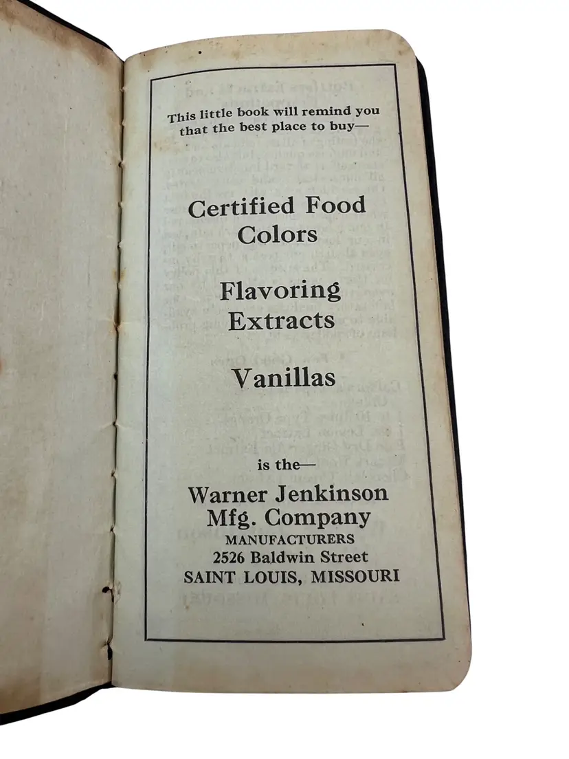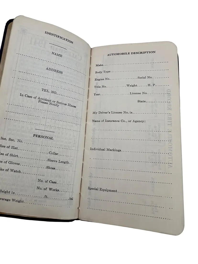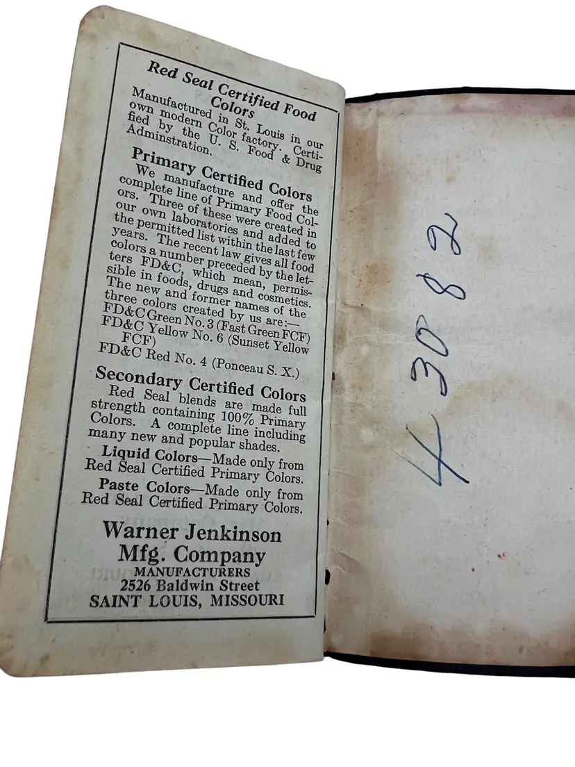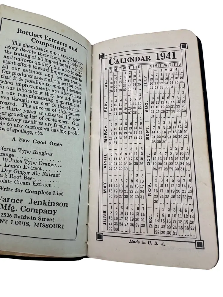 Vintage 1941 advertising pocket diary distributed by Warner-Jenkinson Mfg. Co. of St. Louis for its Red Seal certified food colors. Tall wallet format with textured black leatherette boards and a bold red “Red Seal” emblem. Contents include a complete 1941 calendar, postal and mileage tables, population figures from the 1940 census, personal and automobile record sections, weekly planner pages, and more miscellaneous information sections. Measures about 5.5" x 2.75". A neat crossover piece for advertising, grocery/food color, calendar and ephemera collectors.
