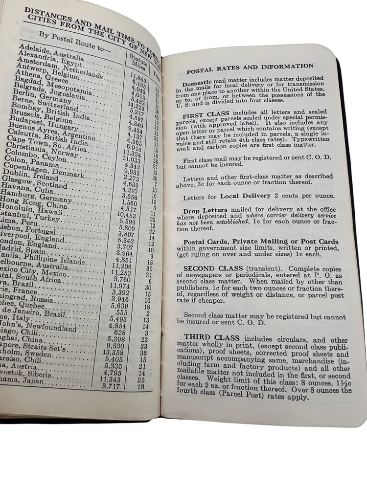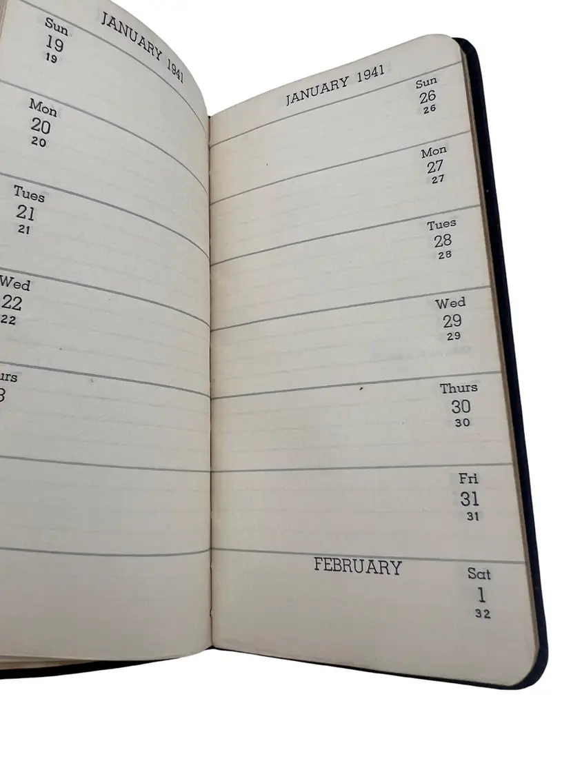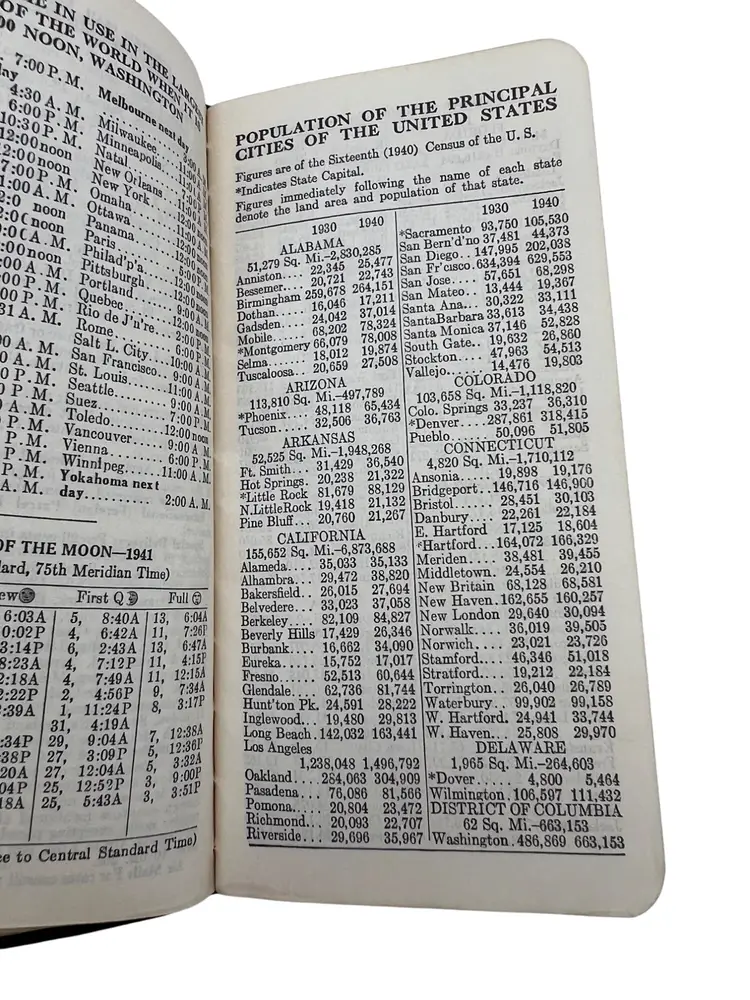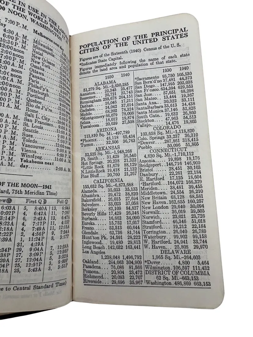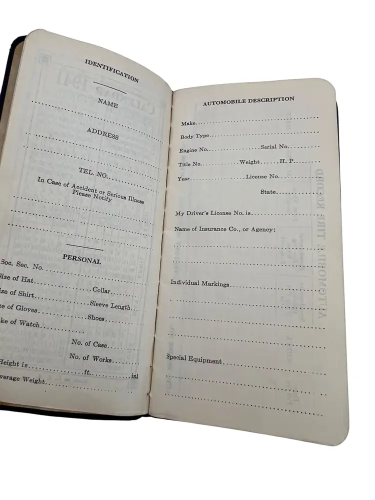 Vintage 1941 advertising pocket diary distributed by Warner-Jenkinson Mfg. Co. of St. Louis for its Red Seal certified food colors. Tall wallet format with textured black leatherette boards and a bold red “Red Seal” emblem. Contents include a complete 1941 calendar, postal and mileage tables, population figures from the 1940 census, personal and automobile record sections, weekly planner pages, and more miscellaneous information sections. Measures about 5.5" x 2.75". A neat crossover piece for advertising, grocery/food color, calendar and ephemera collectors.