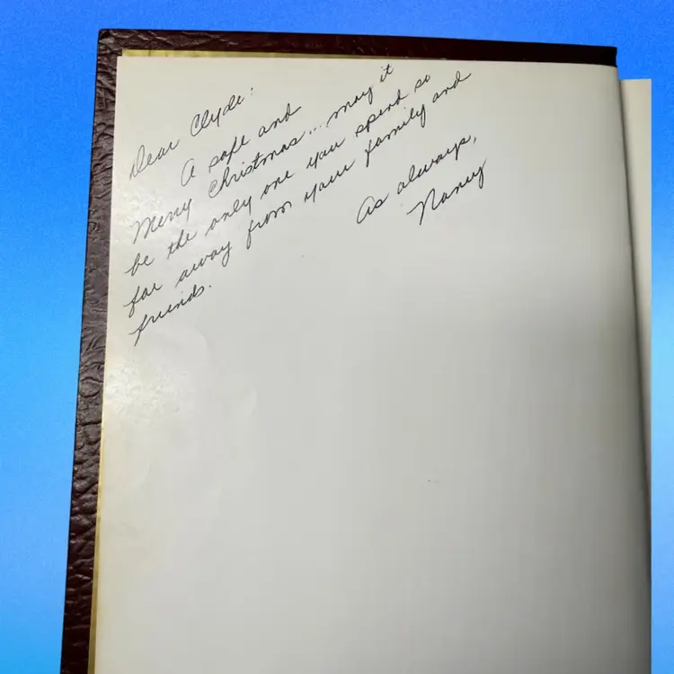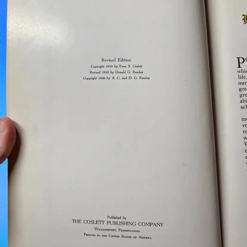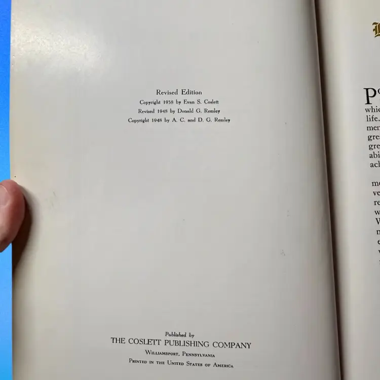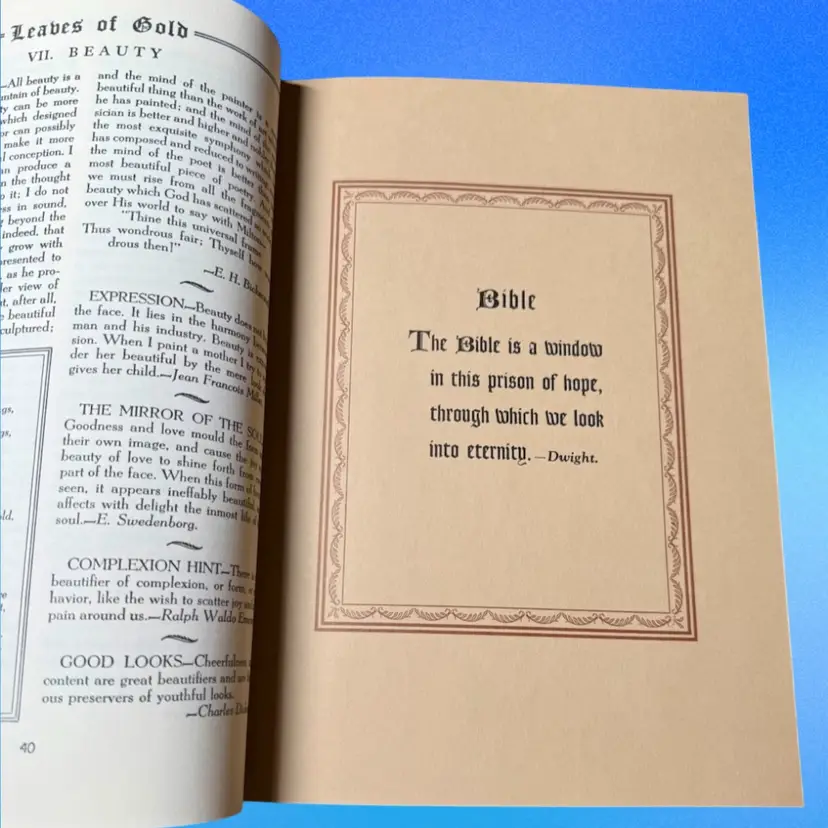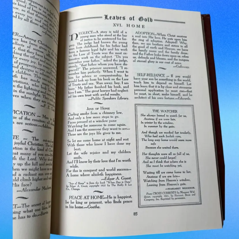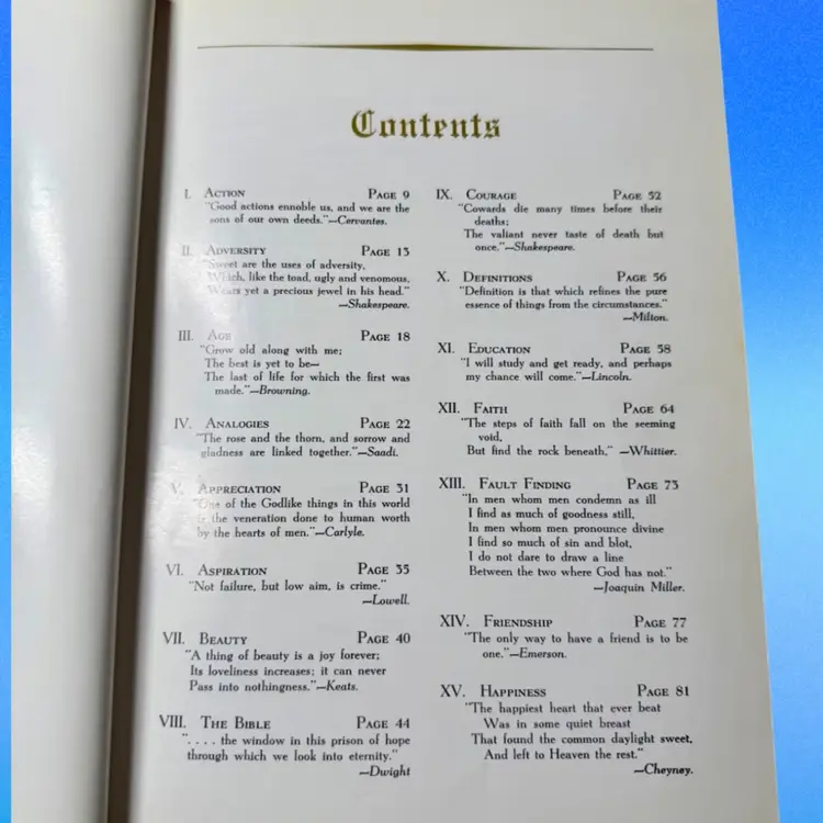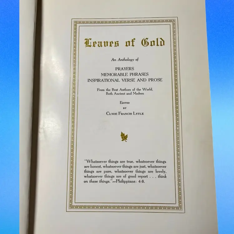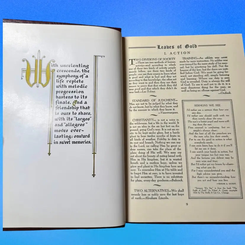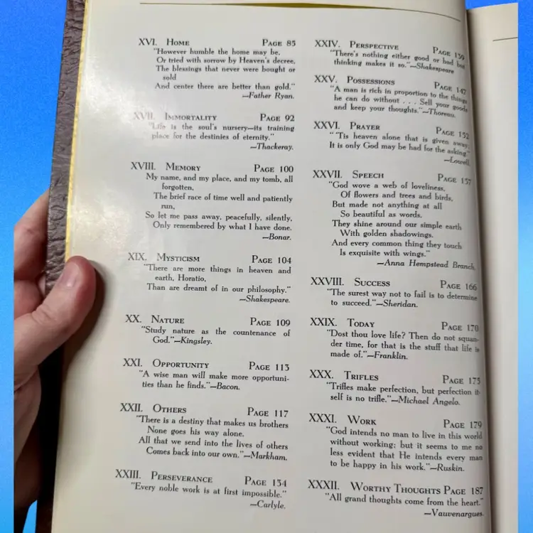11”x8.75”. Leather bound book from 1948. An anthology of prayers, memorable phrases and inspirational verses from both ancient and modern authors. Book is in great condition overall, however it has been signed with a message in pen inside front cover.