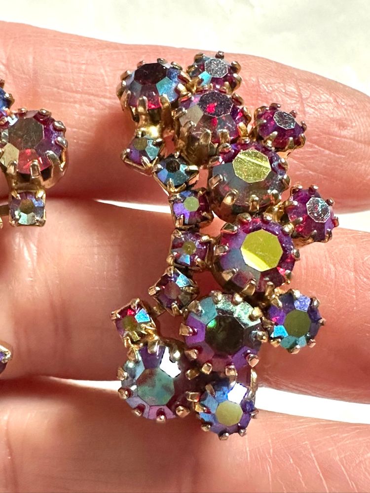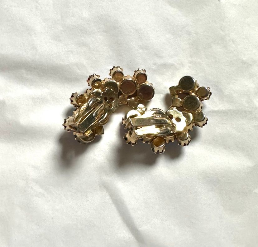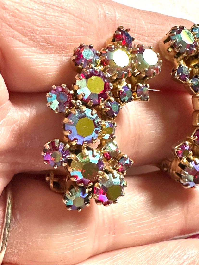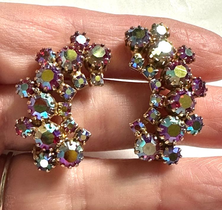 Beautiful sparkly rhinestone clip on earrings. They are crescent shaped. Gold tone setting with red AB stones that reflect red along with blue & purple. They measure 1 1/4”. Condition is excellent.