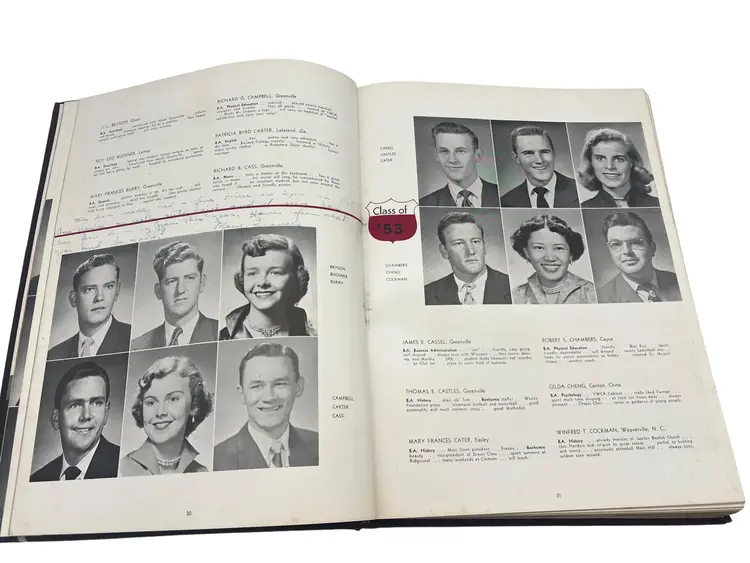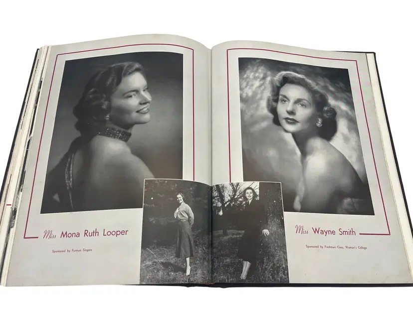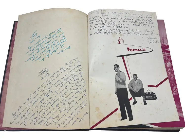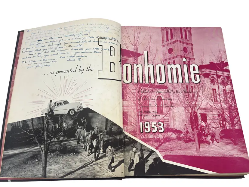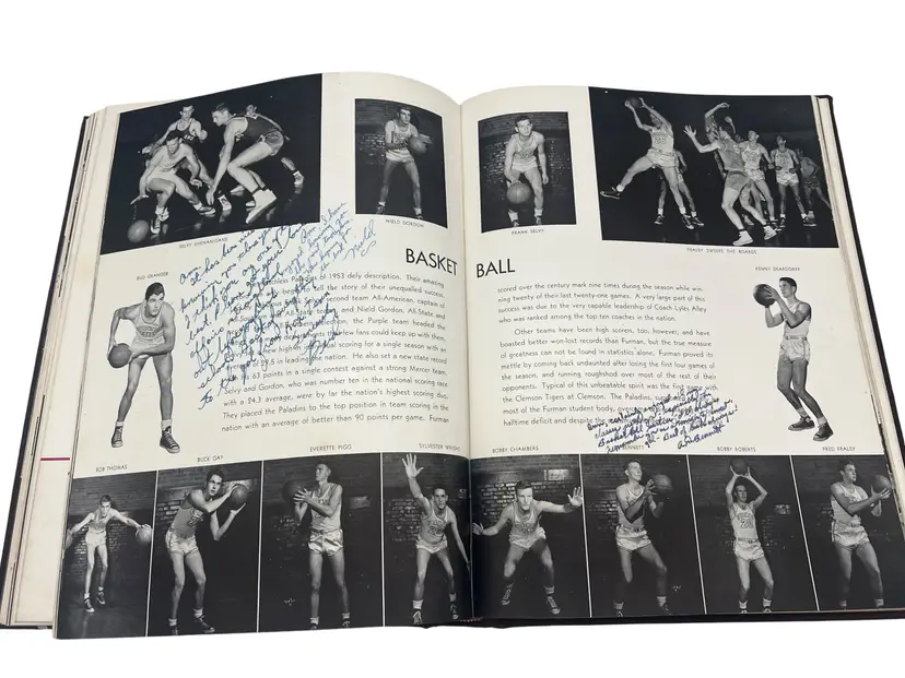 1953 Bonhomie yearbook from Furman University (Greenville, South Carolina). Large hardcover annual measuring about 12.25" x 9.25" with 235 numbered pages. Features campus life, classes, organizations, ads, and athletics, including the men’s basketball team with Frank Selvy in his junior year. A solid piece of Furman and Southern Conference sports history tied to Selvy’s legendary collegiate career.