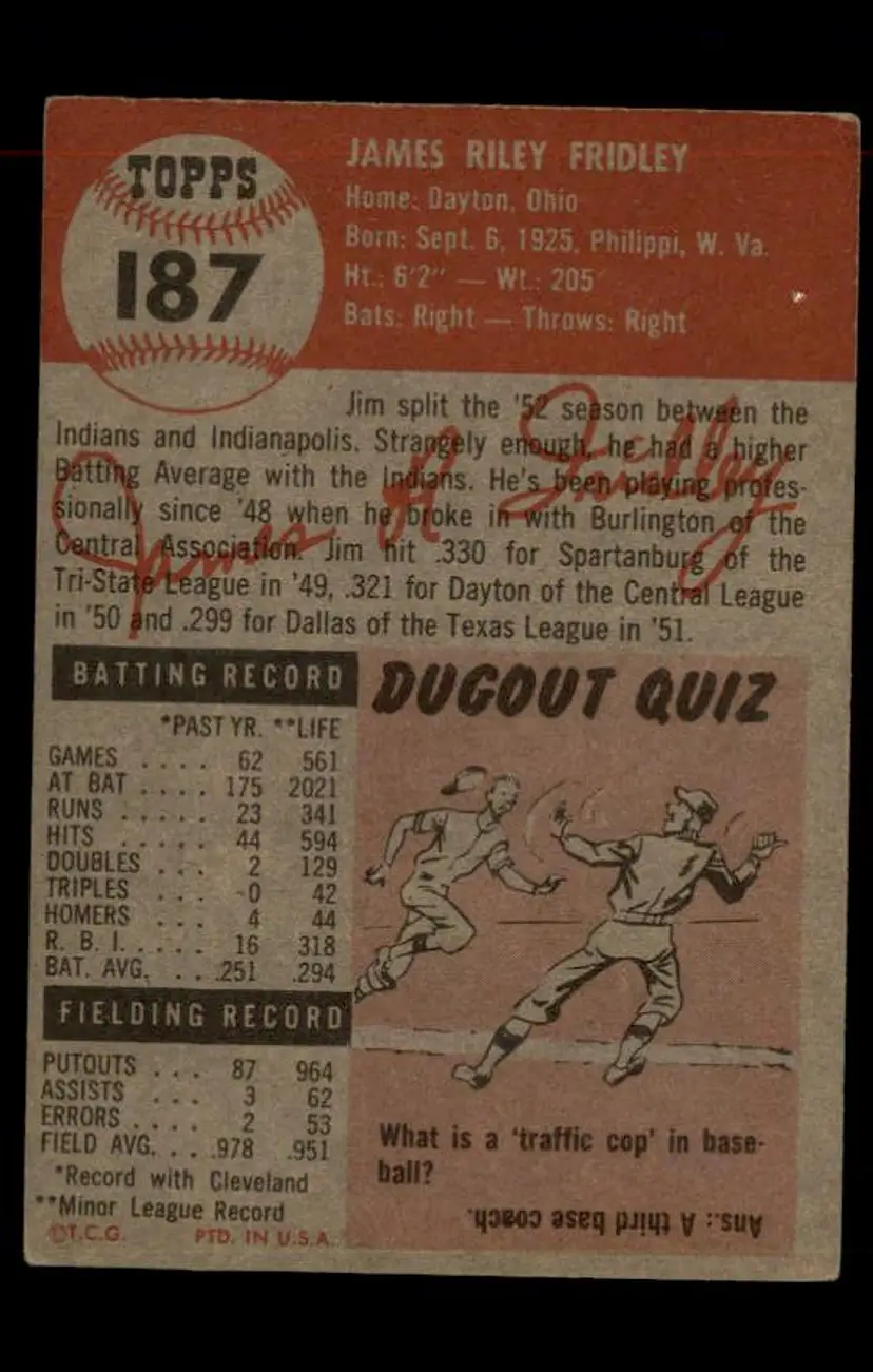1953 Topps #187 Jim Fridley - (pk-tl1) - Cleveland Indians