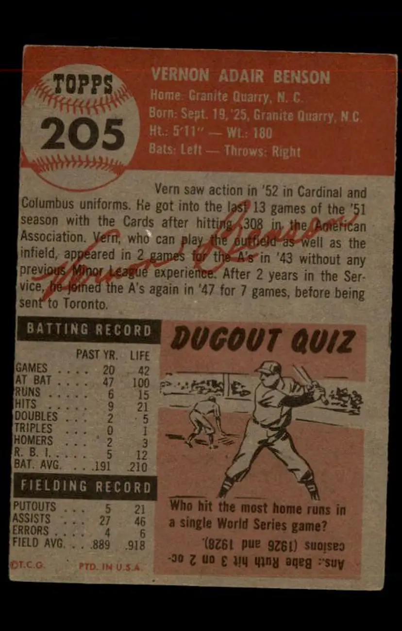 1953 Topps #205 Vern Benson - (pk-tl1) - St. Louis Cardinals