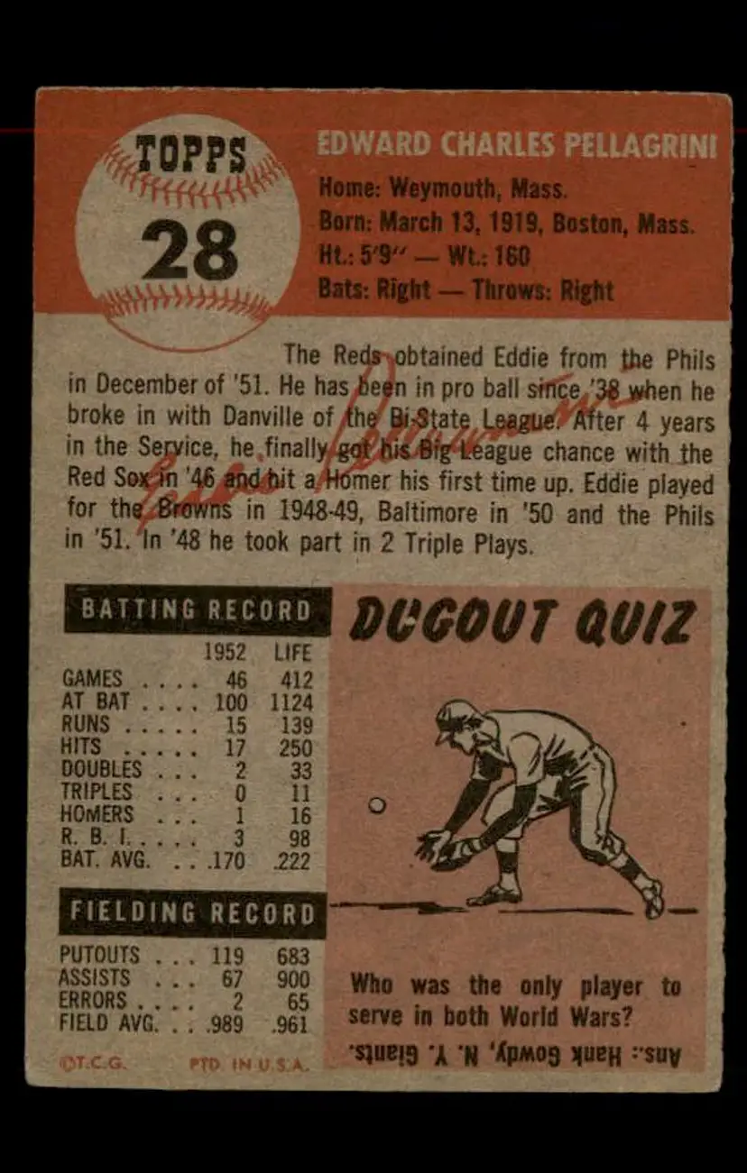 Please see photos for condition. Note that I scan in penny sleeves to protect the cards, so many will show some glare on the back image which is not discoloration. Assume some level of creases, gum stains, or other issues on older vintage cards, though some are much nicer. If you have questions, please ask before purchasing.
