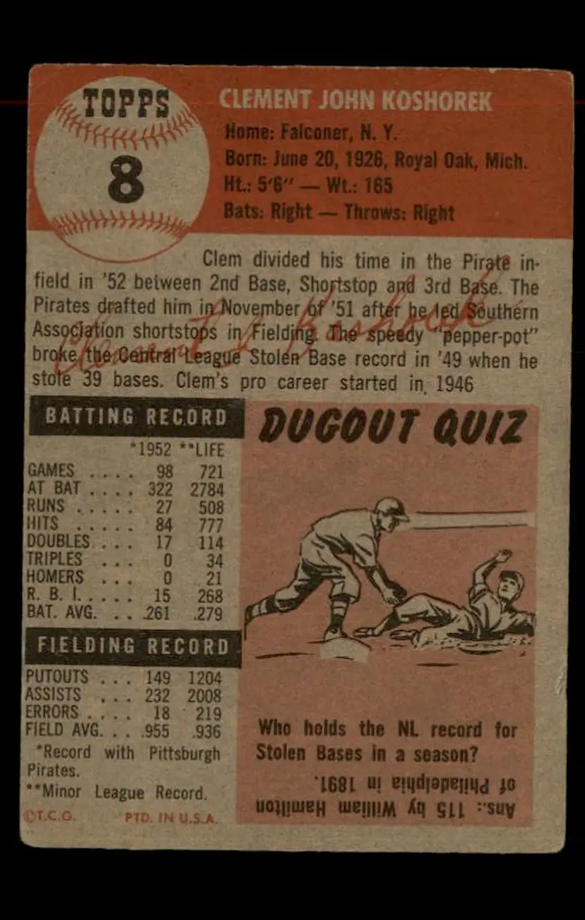 1953 Topps #8 Clem Koshorek - (pk-tl1) - Pittsburgh Pirates