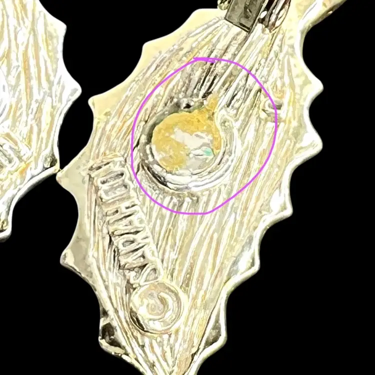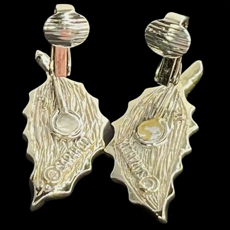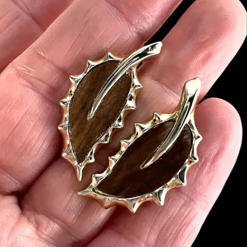 Vintage 1960s Sarah Coventry Clip On Earrings Signed “SARAHCOV” on back Scalloped Leaves in Gold-tone with faux Wood Grain Inset 1-1/4" L x 1/2" W Condition: 1 clip has a little loss of gold color coating, see last photo with purple circle
