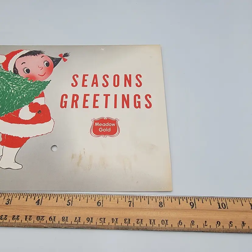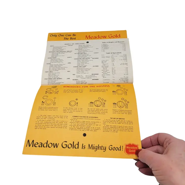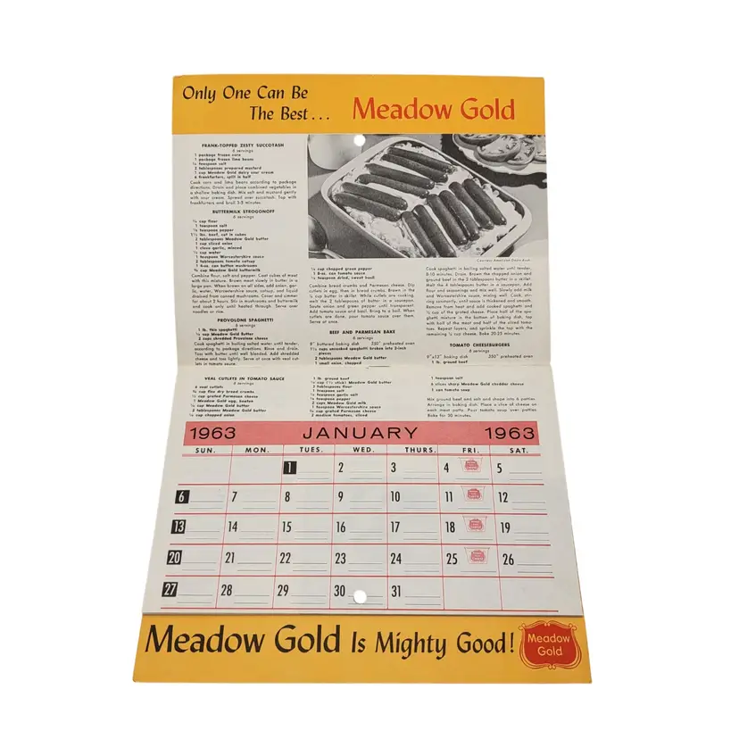 • Includes original 1963 monthly calendar pages • Features vintage recipes and hostess tips • Vibrant holiday-themed cover illustration • Meadow Gold branding throughout
