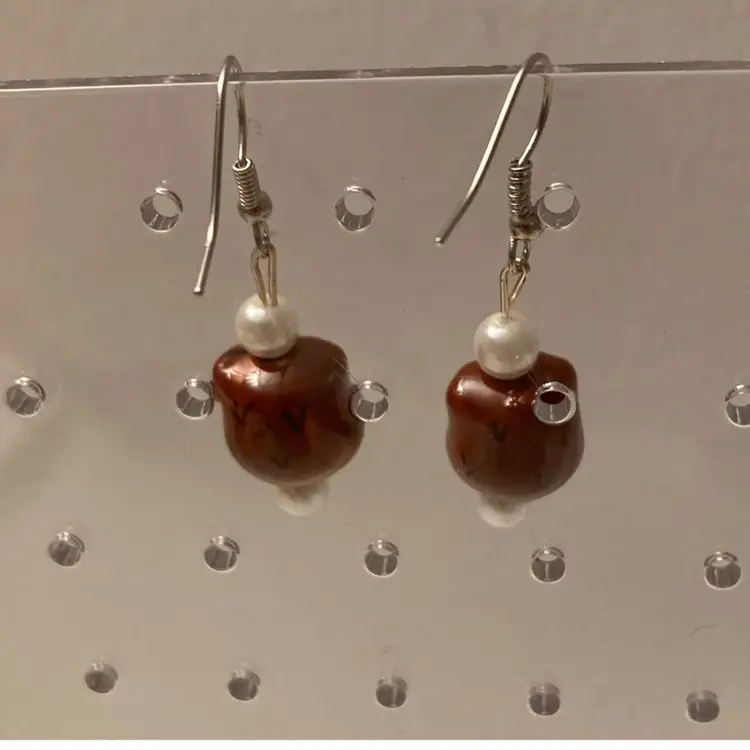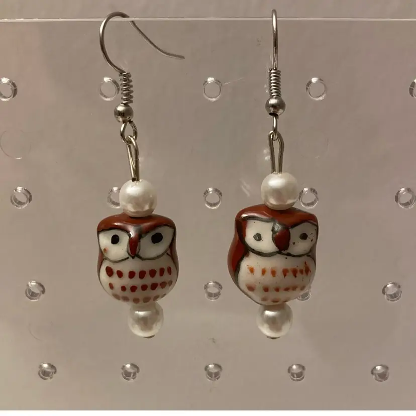 Adorable hand painted porcelain owl earrings. They measure 5/8” across and dangle 2” down.