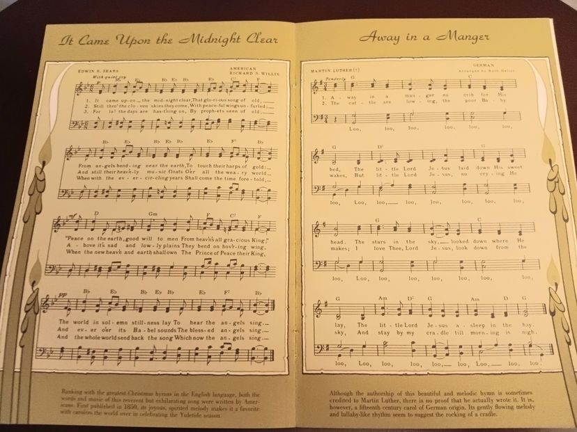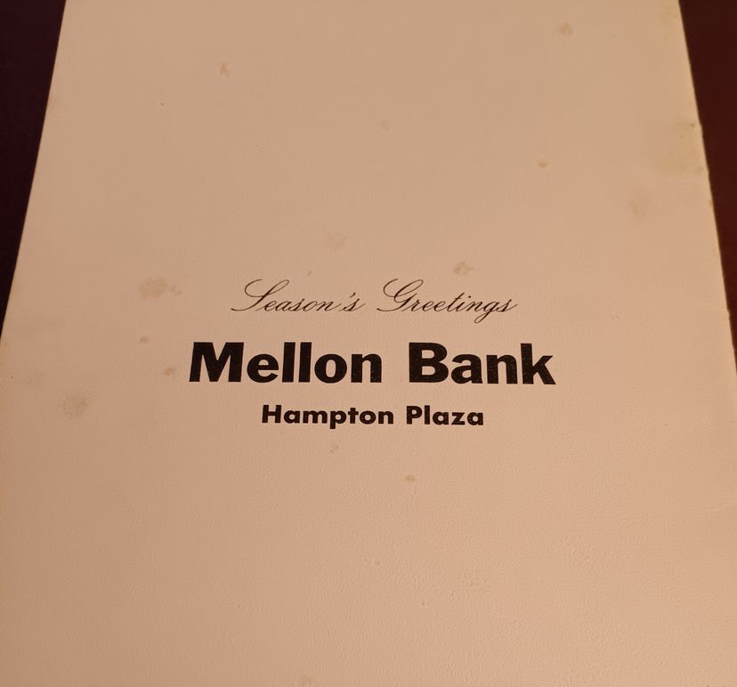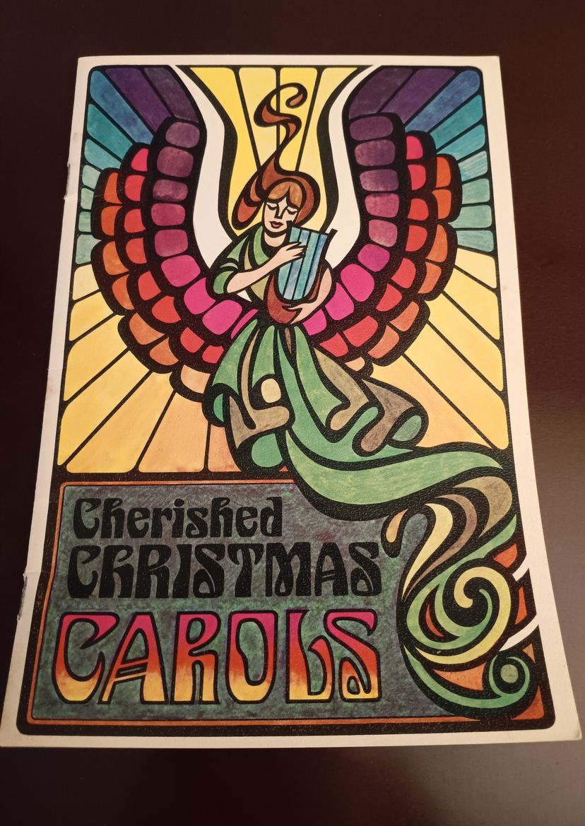 This 1971 vntage "Cherished Christmas Carols" was produced by Mellon Bank as a giveaway to costumer. The multicolor angel artwork makes this a unique and nostalgic collectible item, redolent of the 1970s.