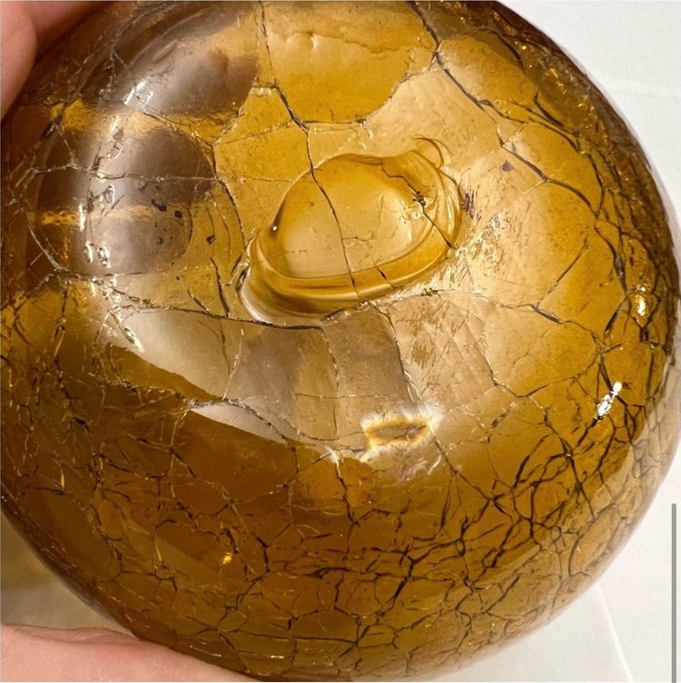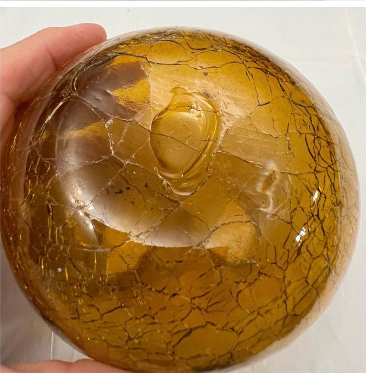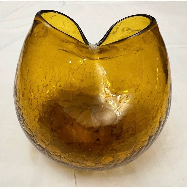 Vintage MCM Blenko Cracked Amber Pinched Vase, Hand Blown Glass Art, Amber Spattered. This piece is an excellent condition on the bottom there is the rainbow spot. I've put in a few pictures so that you may be able to view this Where the pinches meet you can see where the blown glass stop. It is an excellent condition for being vintage. Amber Crackled pinch Vase 4 × 4..
