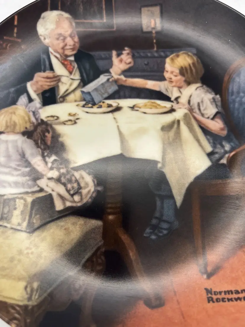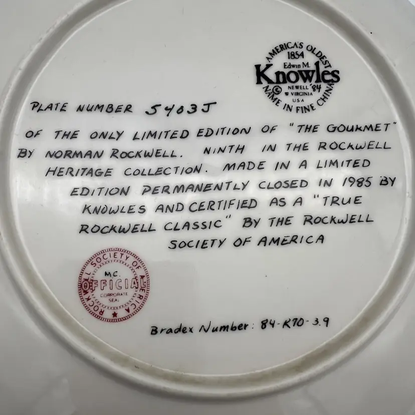 Limited-edition Edwin M. Knowles collector plate featuring Norman Rockwell’s “The Gourmet,” ninth in the Rockwell Heritage Collection. The edition was permanently closed in 1985 and certified by the Rockwell Society of America. This plate measures about 8.5 inches across and carries Bradex number 84-R70-3.9 with plate no. 5403J on the reverse. Great wall-display piece for Rockwell collectors and vintage decor. Not for food use.