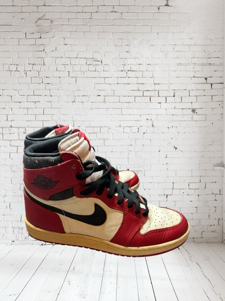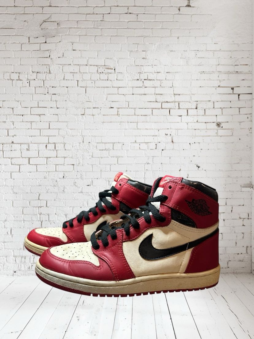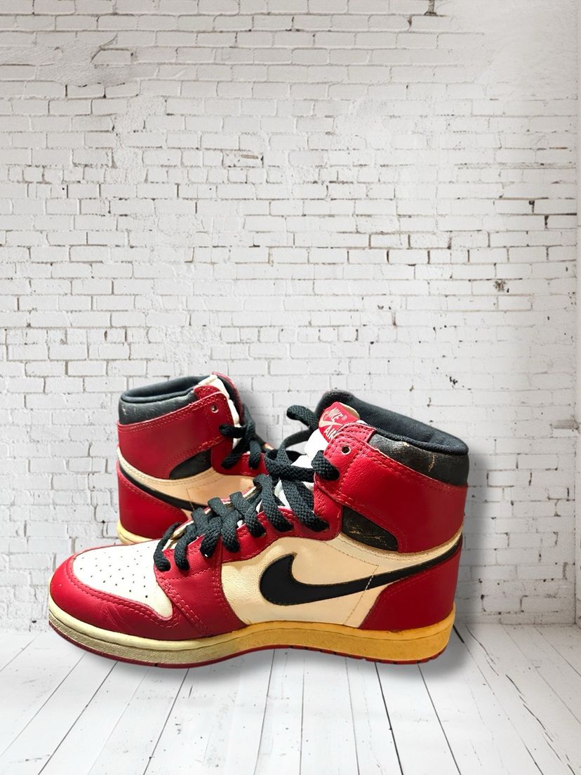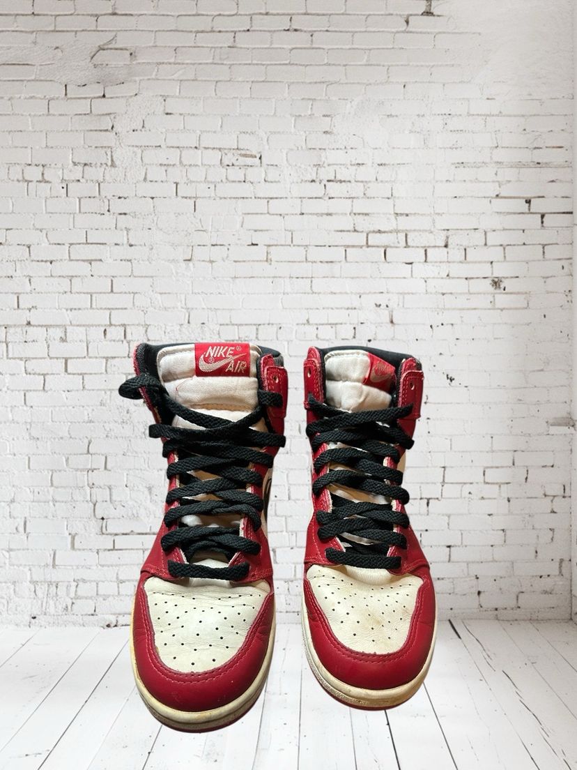 The product is a vintage 1985 Jordan 1 High Chicago sneaker in size 7.5. This high-top shoe features a soft collar and sole, made of leather with a color scheme of white, black, and varsity red. Manufactured in Korea, this Air Jordan 1 model is part of the iconic Air Jordan product line and is known for its classic Chicago design. A coveted collector's item for sneaker enthusiasts, this 1985 release showcases the style and craftsmanship that Jordan is renowned for.