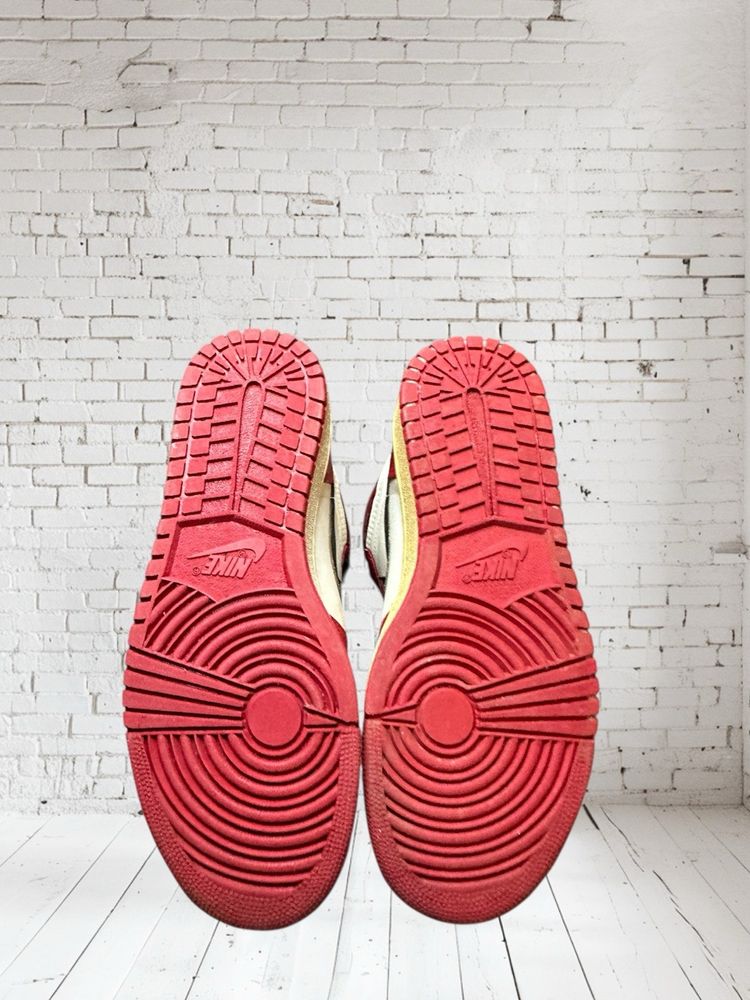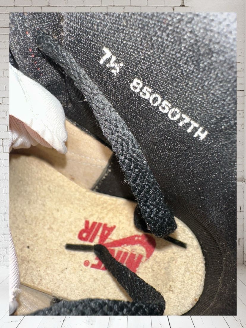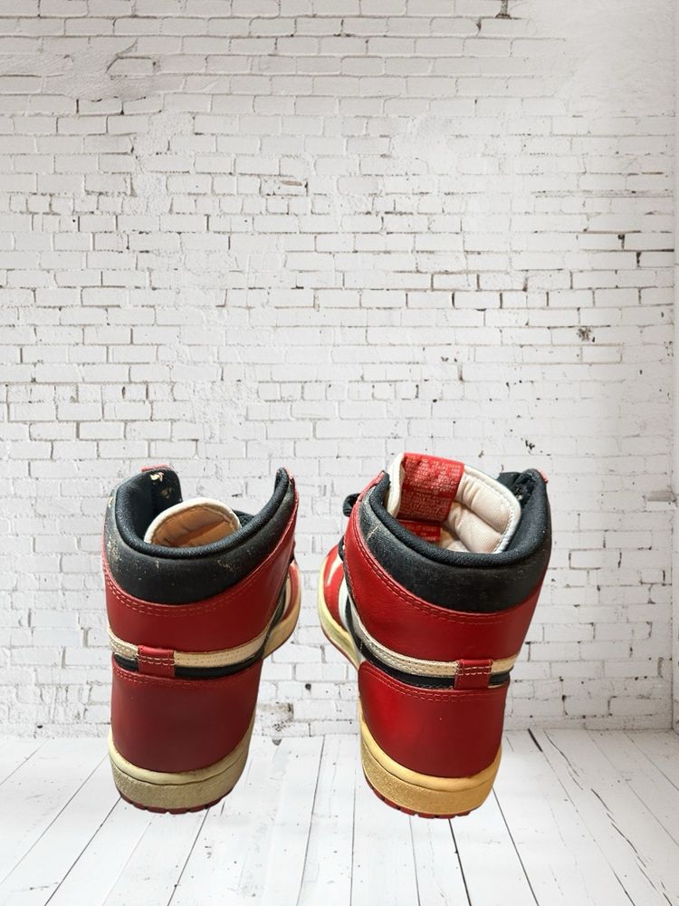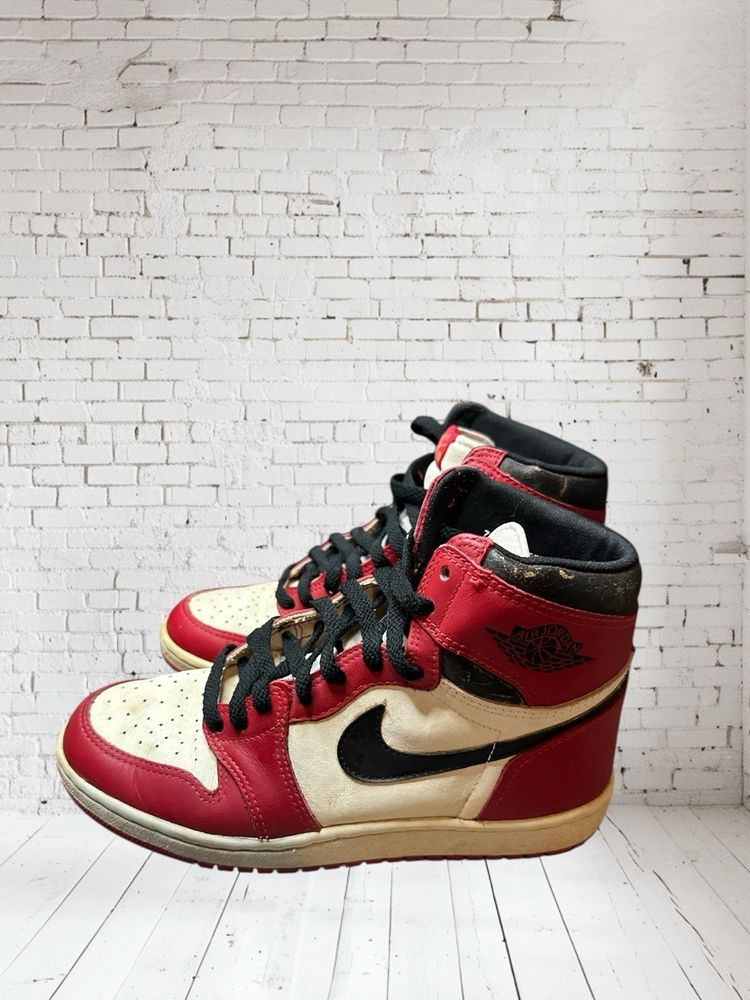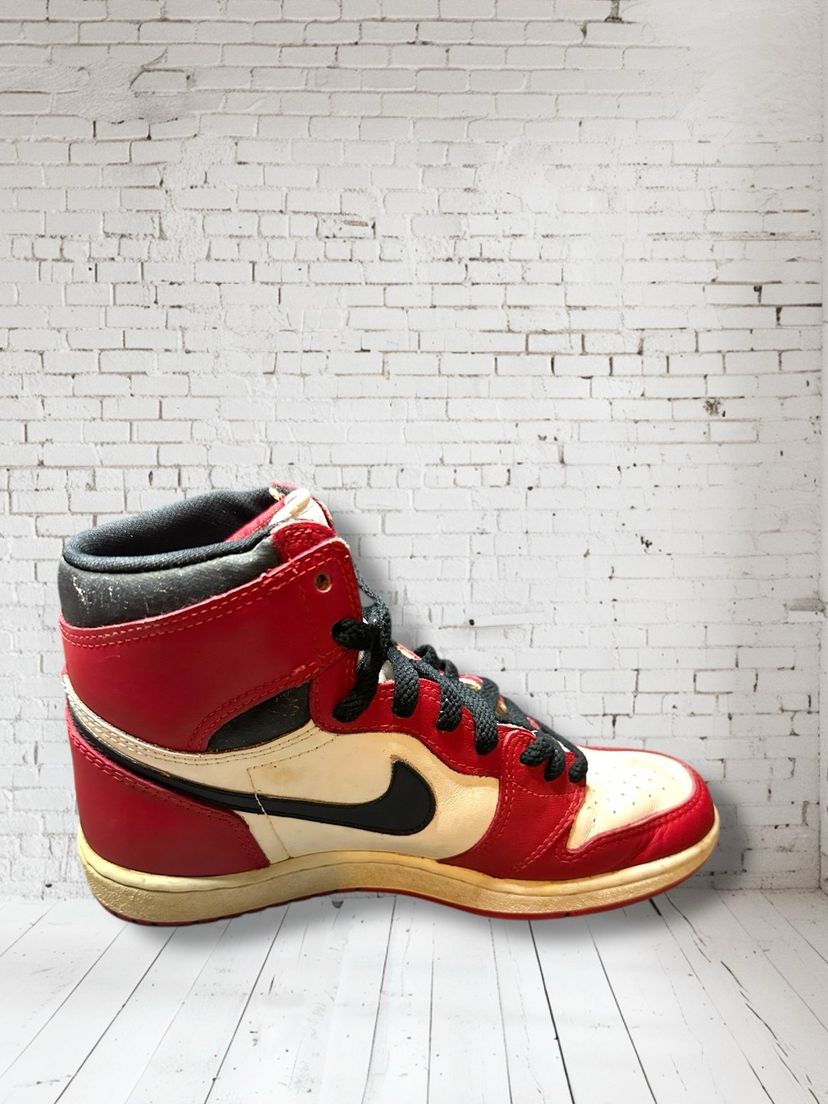The product is a vintage 1985 Jordan 1 High Chicago sneaker in size 7.5. This high-top shoe features a soft collar and sole, made of leather with a color scheme of white, black, and varsity red. Manufactured in Korea, this Air Jordan 1 model is part of the iconic Air Jordan product line and is known for its classic Chicago design. A coveted collector's item for sneaker enthusiasts, this 1985 release showcases the style and craftsmanship that Jordan is renowned for.