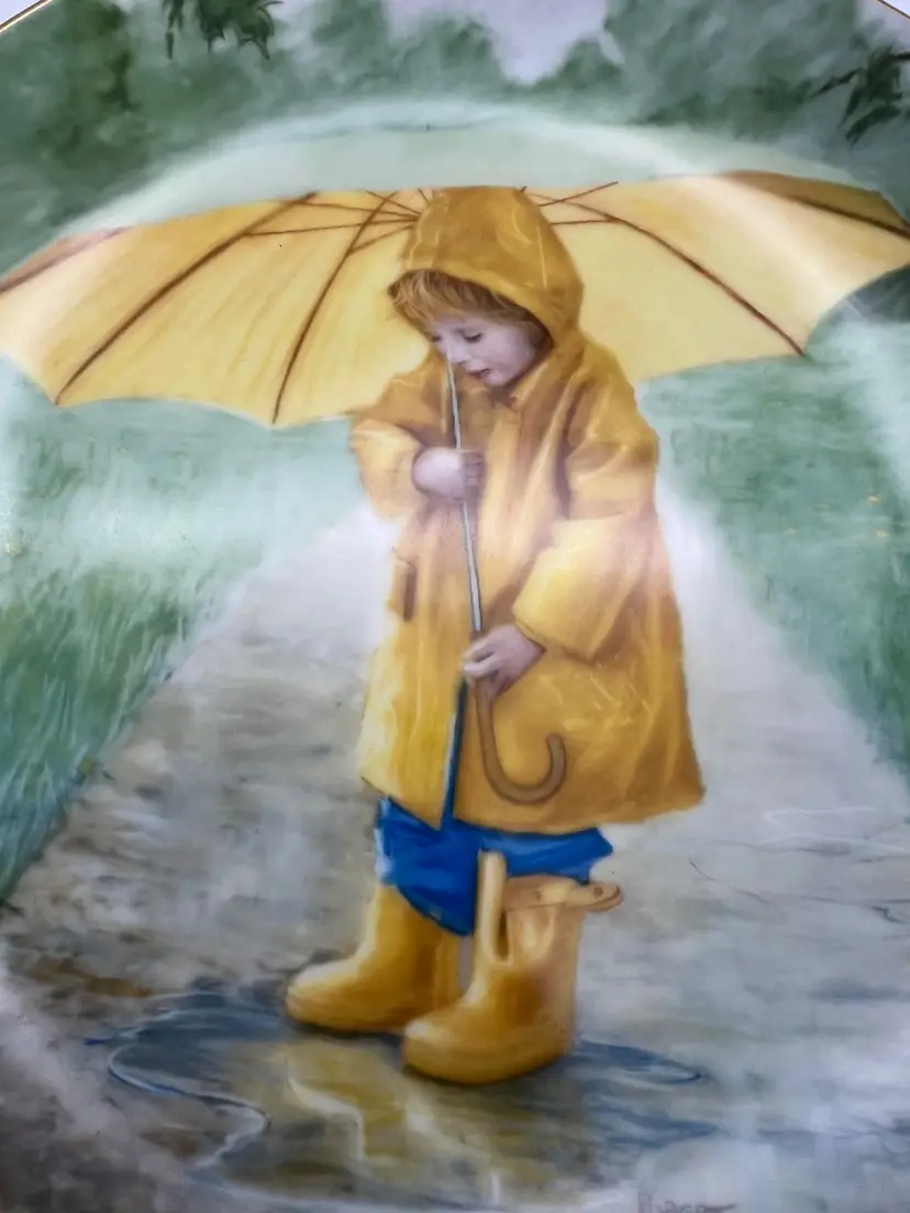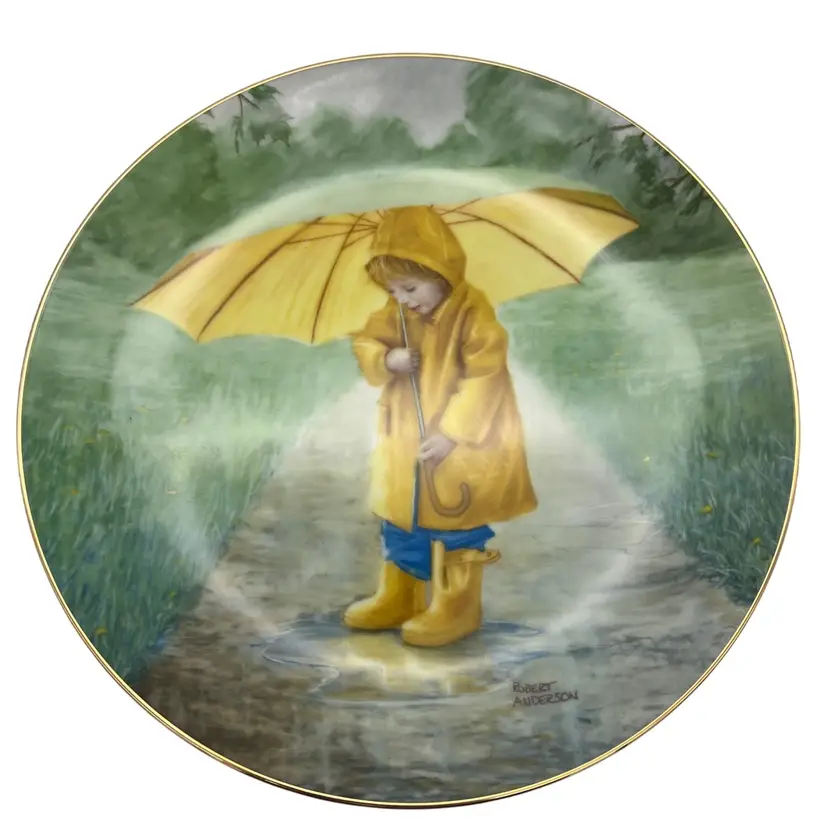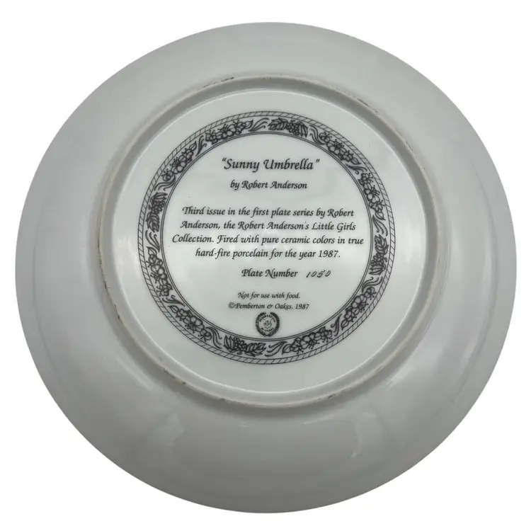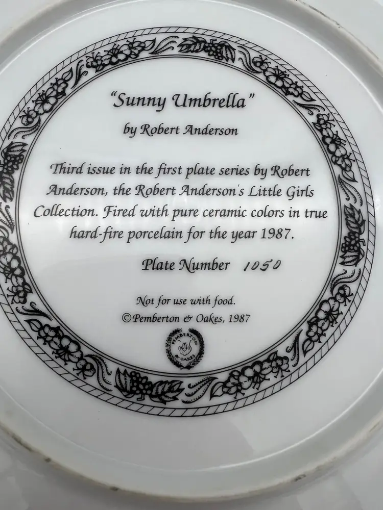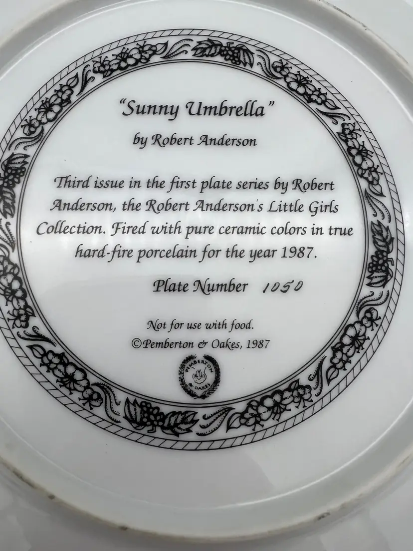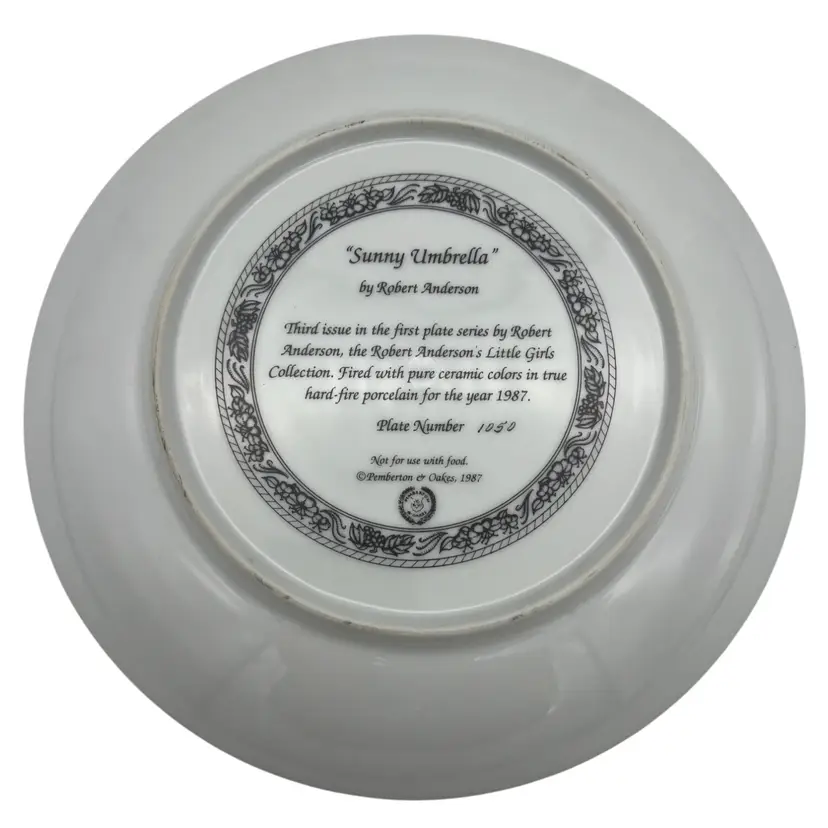 Pemberton & Oakes fine porcelain collector plate titled “Sunny Umbrella” by Robert Anderson, the third issue in Robert Anderson’s Little Girls collection. The plate measures about 8.5 inches across with a gold rim and is dated 1987 on the back; plate number 1050.