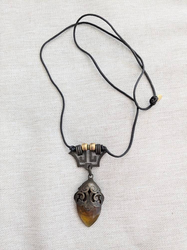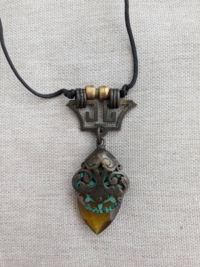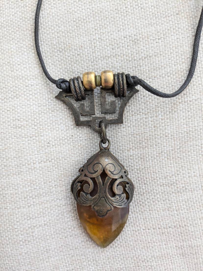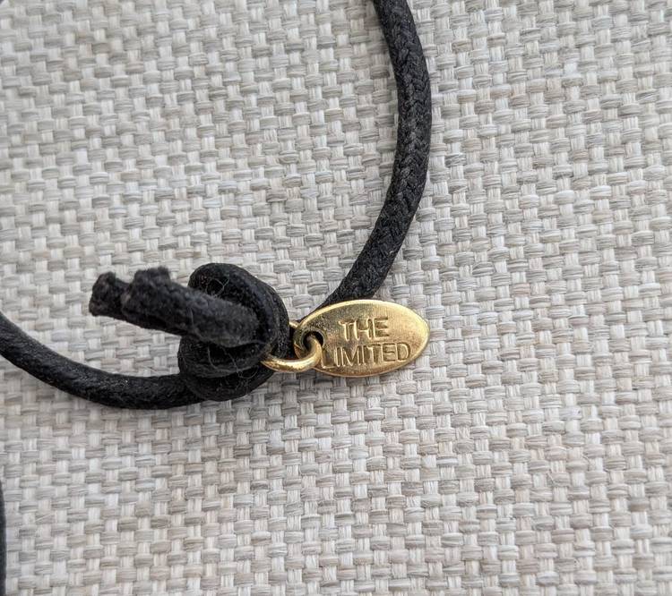 A classic. The pendant is 3-1/2" long and is strung on a leather or faux leather cord that is 30" long. Marked The Limited.