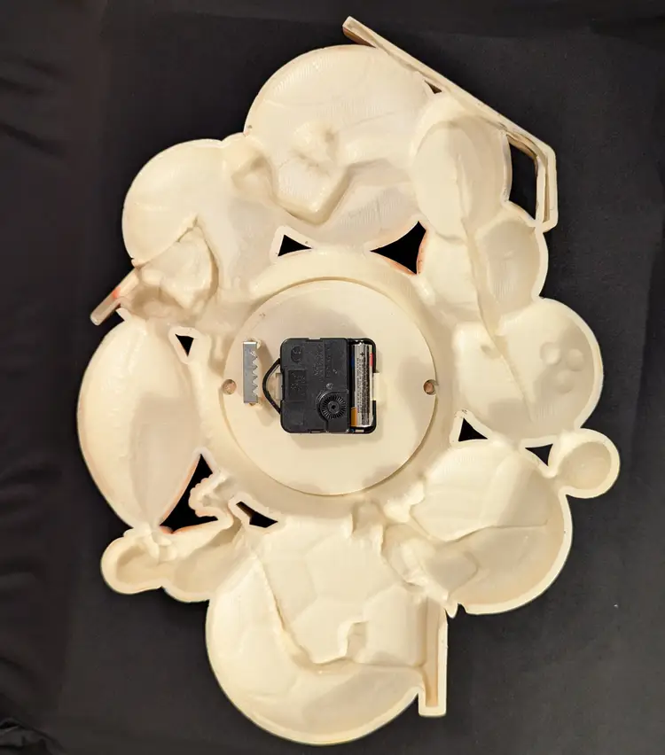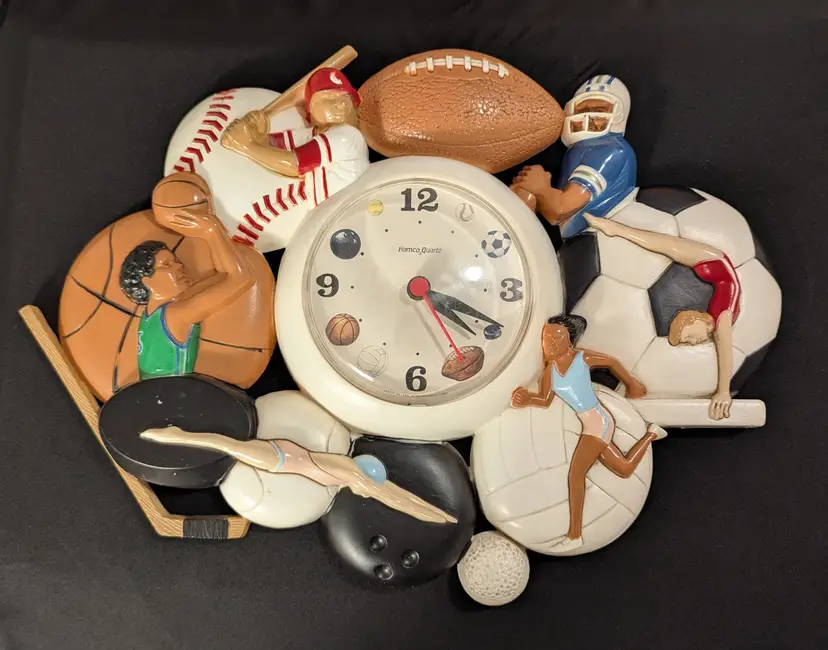 Sports-themed working resin clock. Good vintage condition. Some scratches on the clock face. Measures 16.5" x 12". Takes one AA battery (not included).
