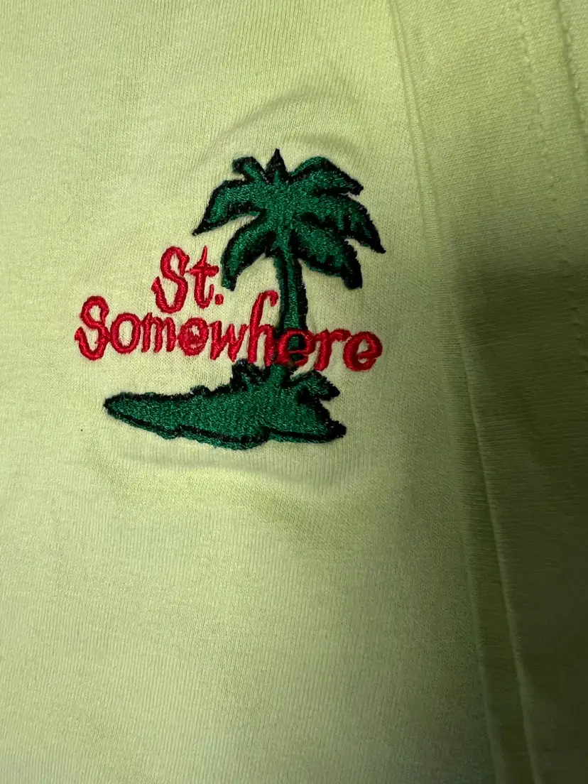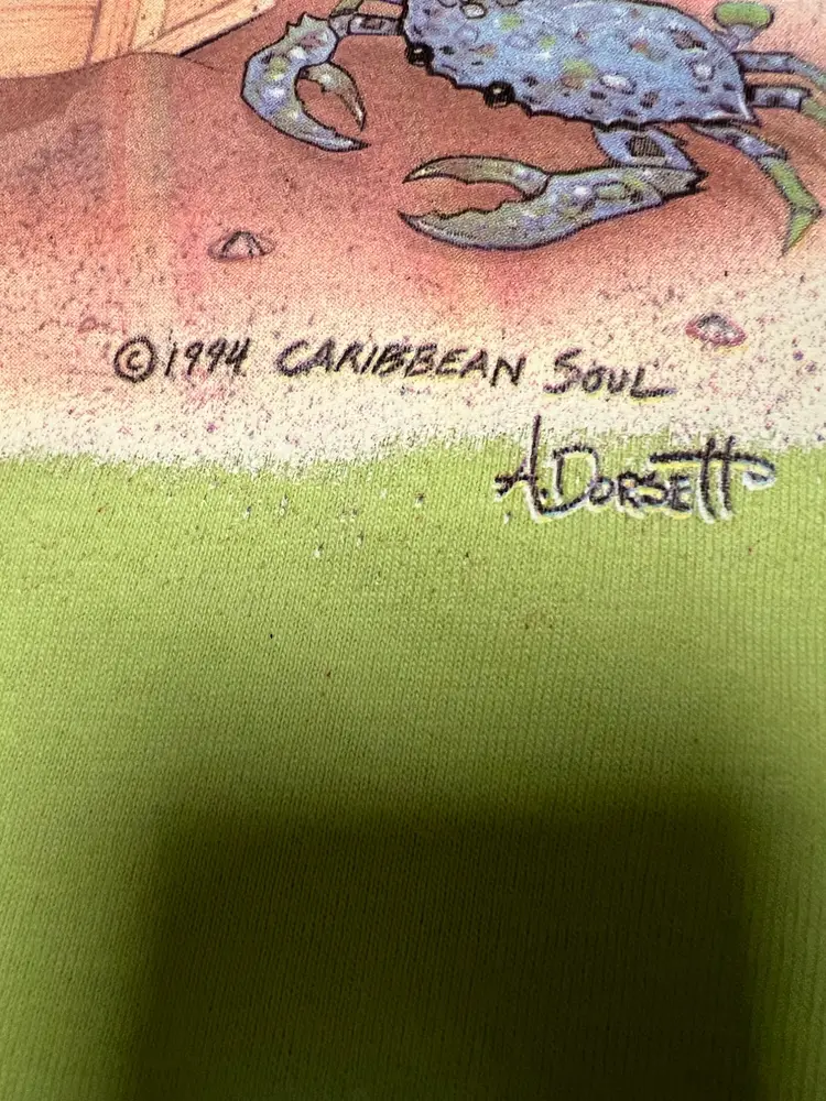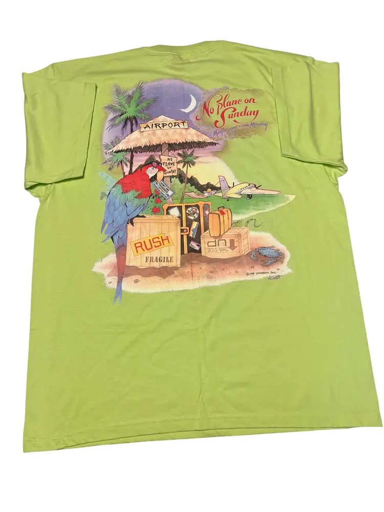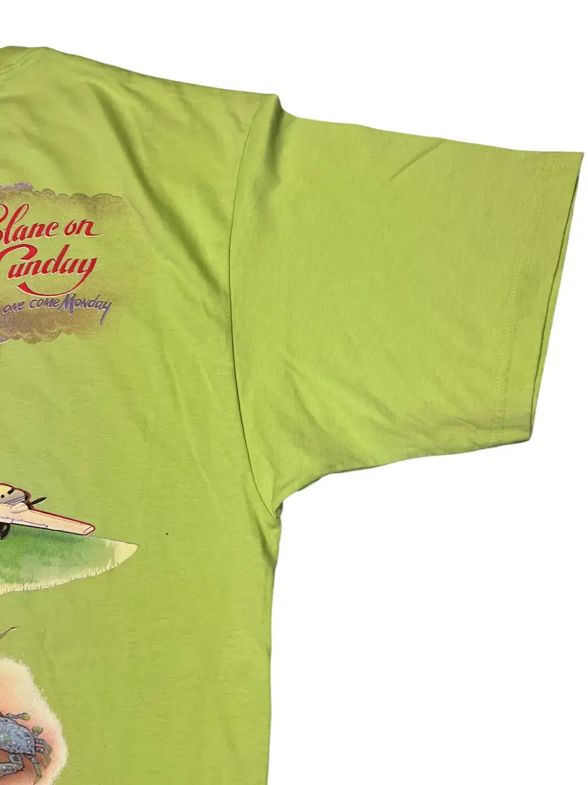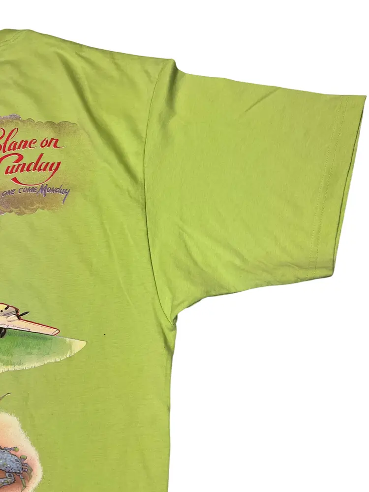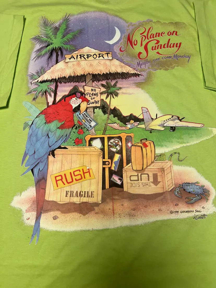 Vintage 1994 Caribbean Soul T-shirt with the classic “No Plane on Sunday” back graphic (A. Dorsett art). Lime green cotton tee, XXL, measuring 25" pit-to-pit x 33" long. The small “St. Somewhere” palm-tree embroidery at the chest appears to be a local add-on tied to the Knoxville, Tennessee trop-rock band of that name that was active in the late 1990s and early 2000s. Great piece for Parrotheads, fans of St. Somewhere, and ’90s beachwear collectors.