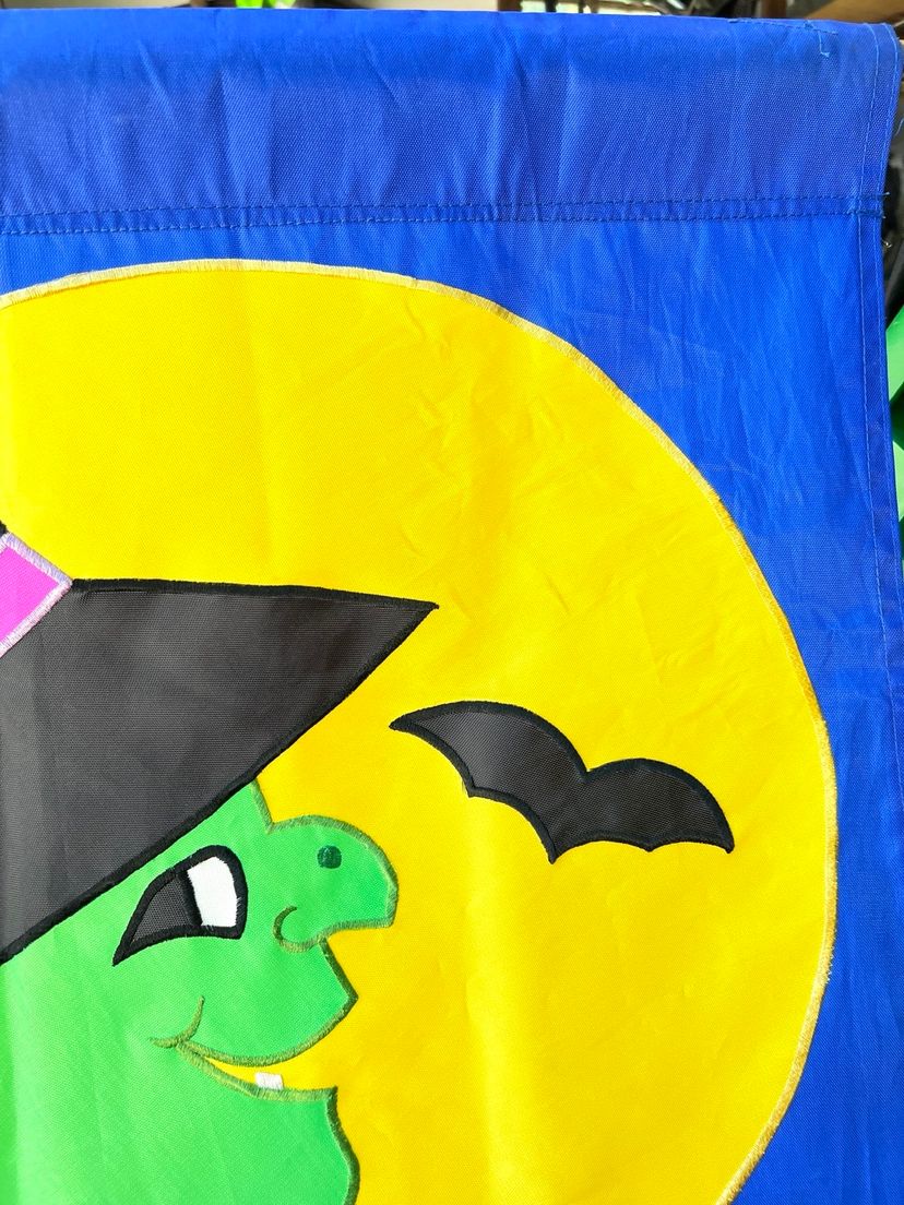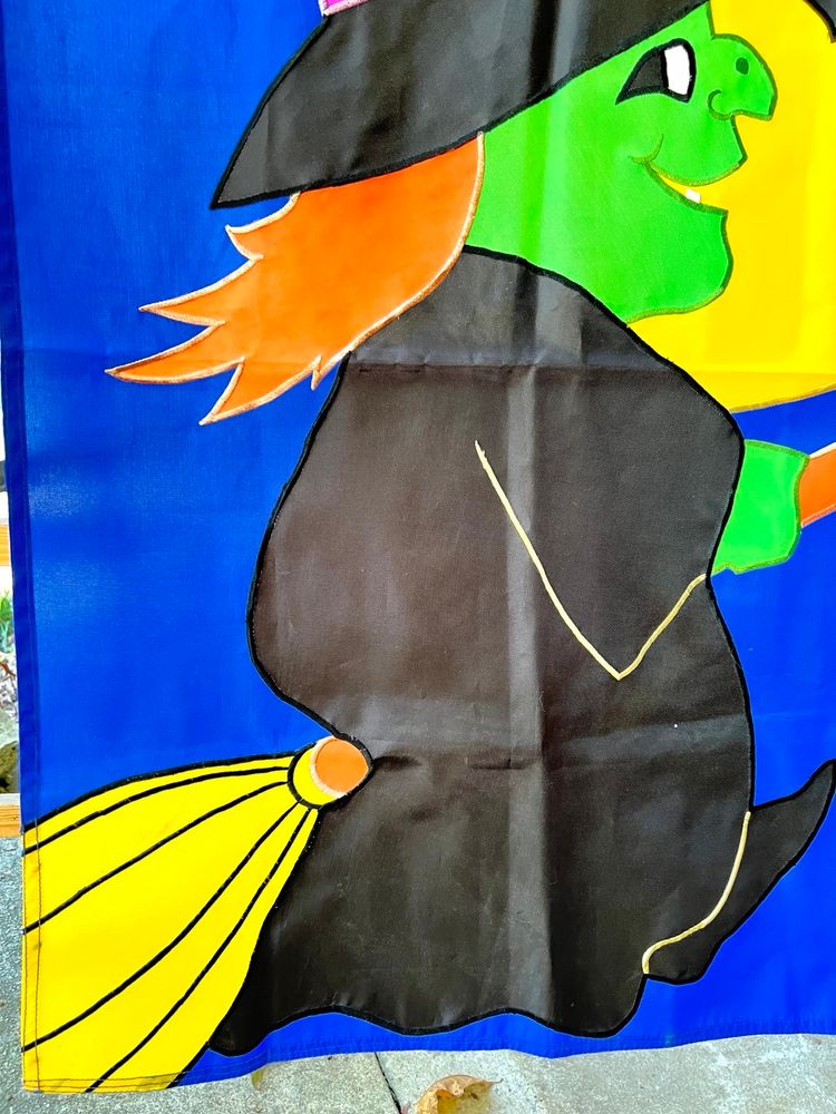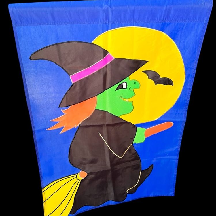 Youβll go just batty at this decorative flag! Cackle & howl with delight watching the vintage beauty fly! 1994 Witch On Broom Moon π & Bat π¦ in background Halloween Garden Flag Manufacturer Tag- Artistic Flags 100% Nylon 28-1/2β X 39-1/2β Nice 2β reinforced opening for flag pole Condition: Excellent! Bright bold color. No rips, tears, stains. It has been folded so there will be creases.