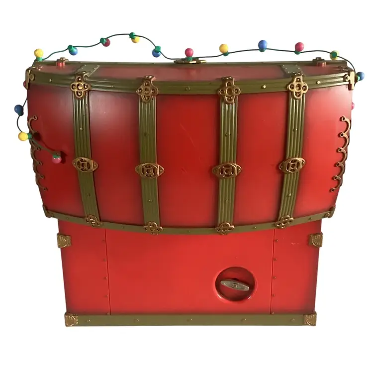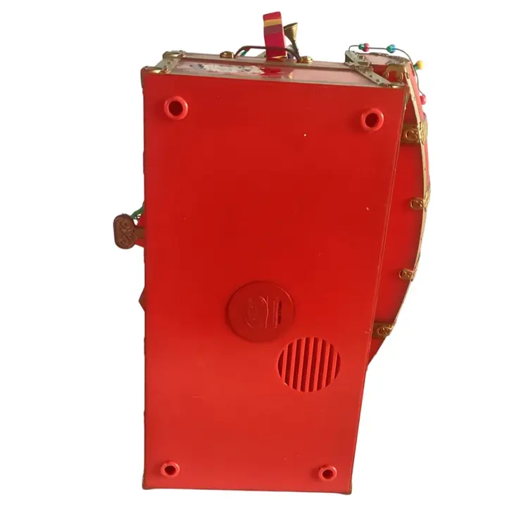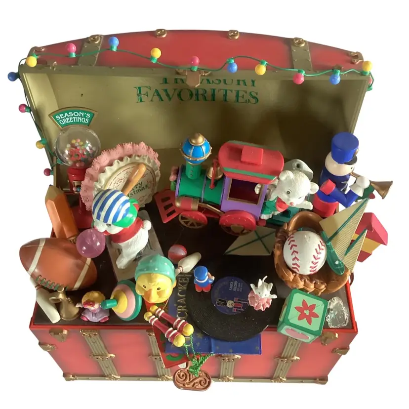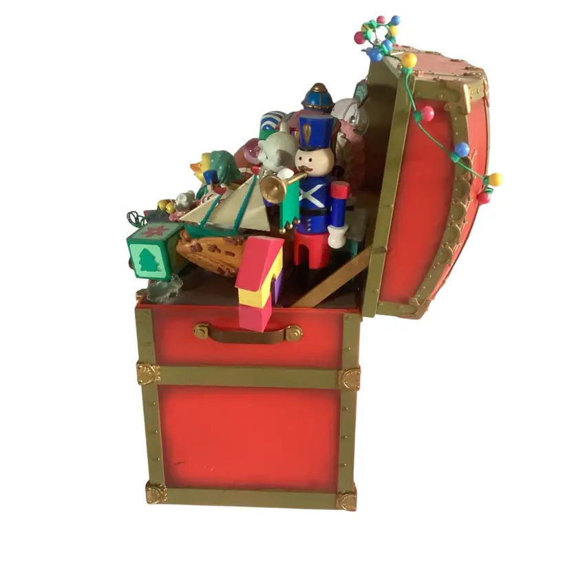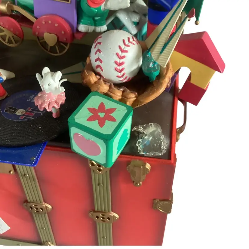 Works and plays very well. Plays "Toyland" Measures 9 x 8 x 4 Missing the Santa Jack in the Box in the front right corner. No other damage.