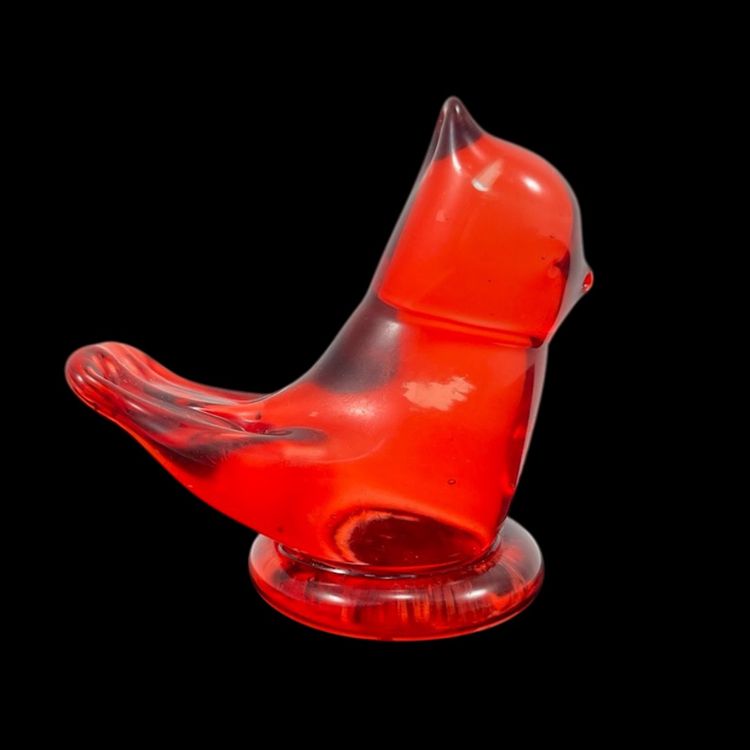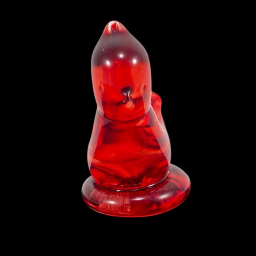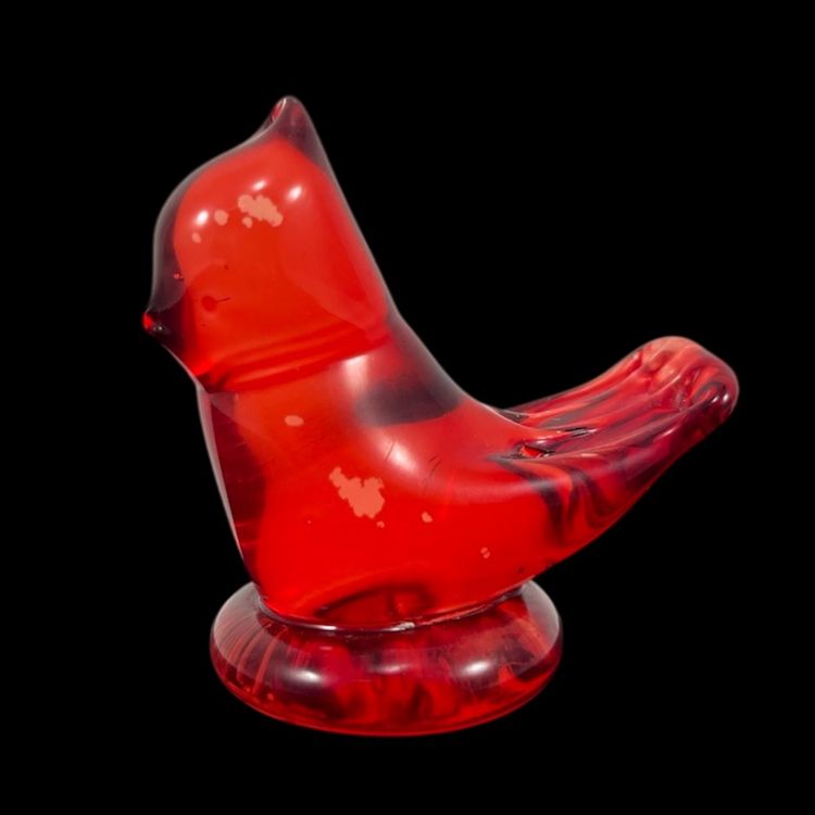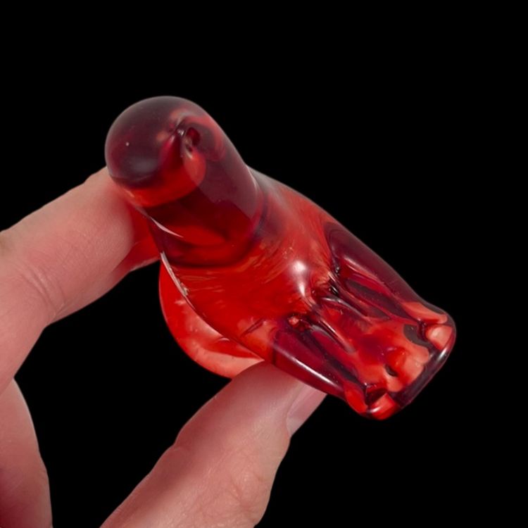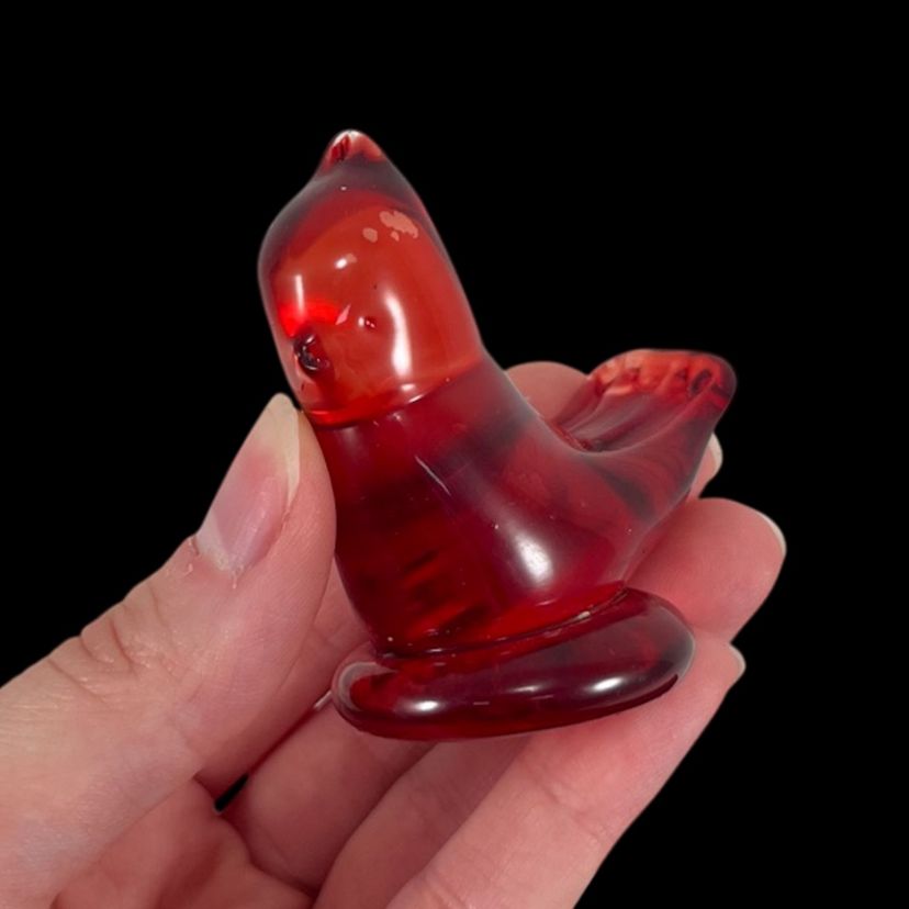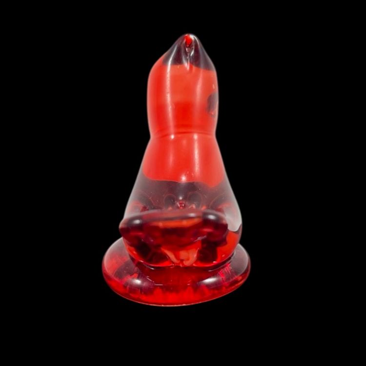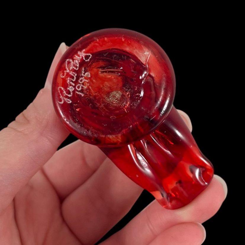 Approximately 2.25” x 1.25” x 2 1/8”. No chips or cracks. Appears to be flashed glass (red color applied over glass). Please see photos to see spots of wear to the red coloring on the glass.
