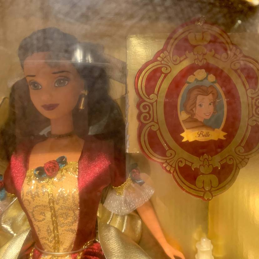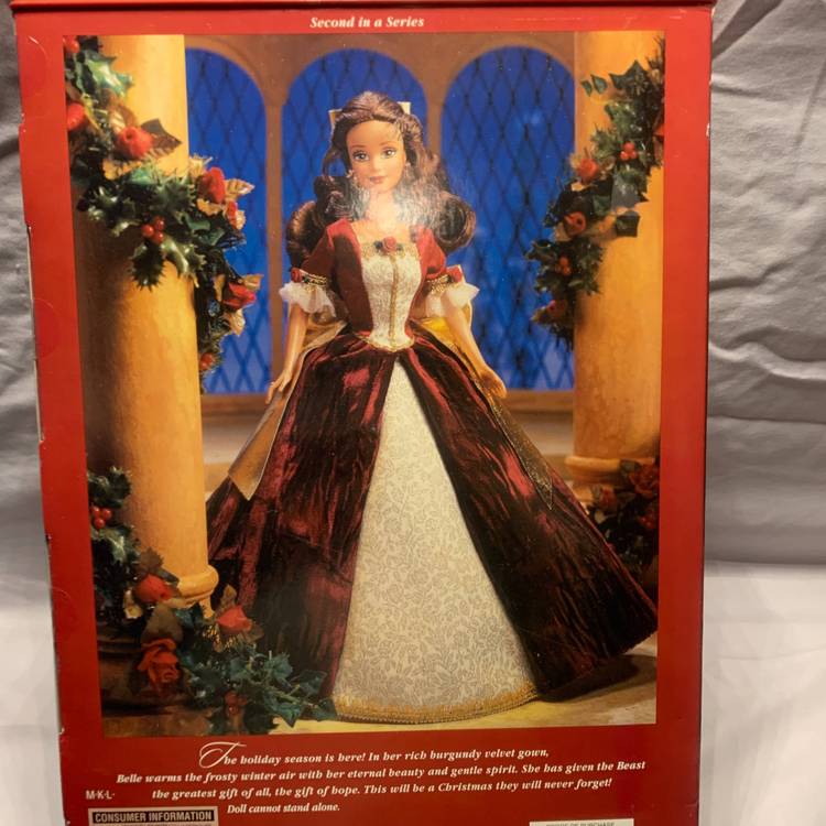 The 1997 Mattel Disney's Beauty and the Beast "Holiday Princess Belle" doll is a special edition collectible featuring the beloved character Belle from Disney's Beauty and the Beast franchise. This 12-inch fashion doll has brown wavy hair, green eyes, and a light complexion, making her an intricate and detailed replica of the animated character. Packaged in its original unopened box, this doll is a perfect addition to any Disney Barbie doll collection, especially for those who appreciate Christmas-themed merchandise from the 1990s.