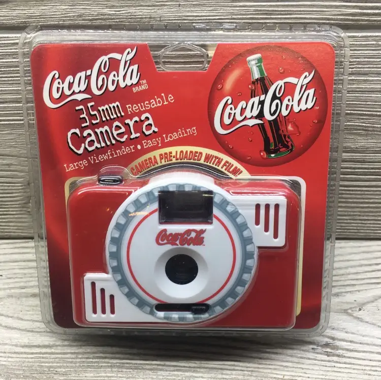 The Vintage 1999 Coca-Cola 35mm Reusable Camera is a compact camera with a nostalgic appeal, featuring a classic red color and branded with the iconic Coca-Cola logo. It is equipped with manual focus and uses 35mm film, perfect for photography enthusiasts looking to explore the world of film photography. This camera is a unique collector's item that is sure to bring a touch of retro charm to any photo shoot.