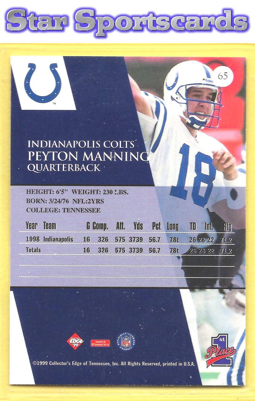 This is a nice example of a 1999 Collector's Edge First Place #65 Peyton Manning .Other important information about this card: In Peyton Manning played for the Indianapolis Colts.Please check out our other listings for more great cards.