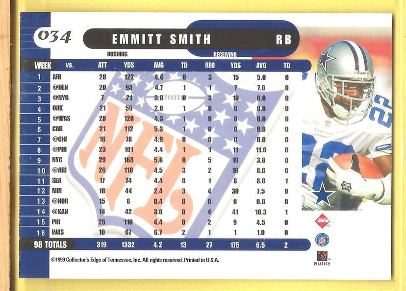 This is a nice example of a 1999 Collector's Edge Supreme #034 Emmitt Smith Gold Ingot .Other important information about this card: In Emmitt Smith played for the Dallas Cowboys.Please check out our other listings for more great cards.