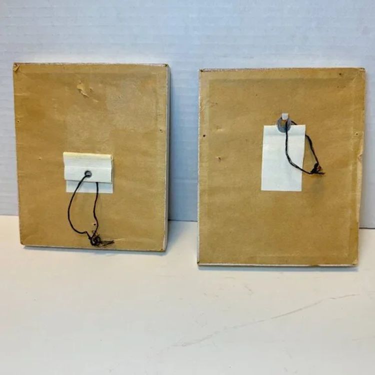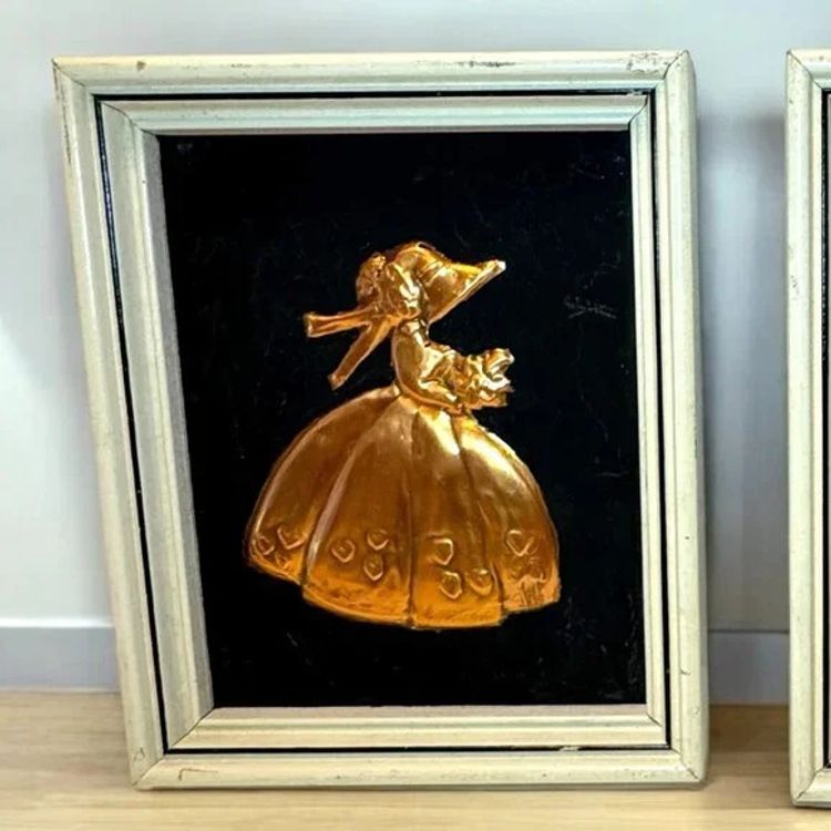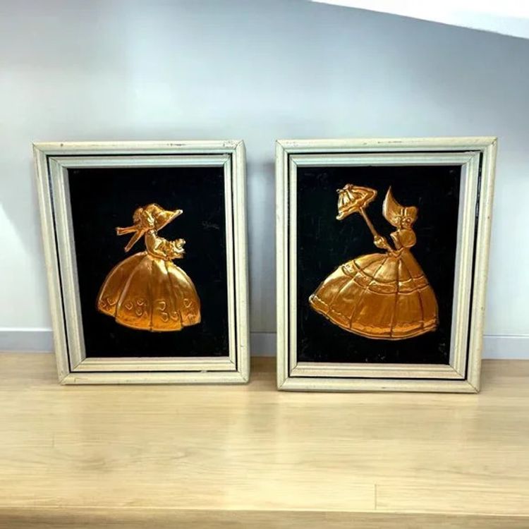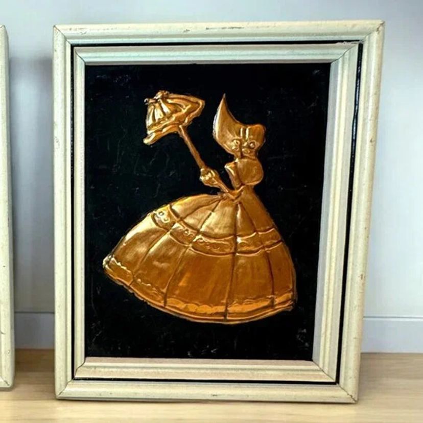 2 Vintage Embossed Copper Art of Victorian Girls with Cream Colored Wooden Frames and a black fabric background. Measuring 6 inches by 4.75 inches 158 grams