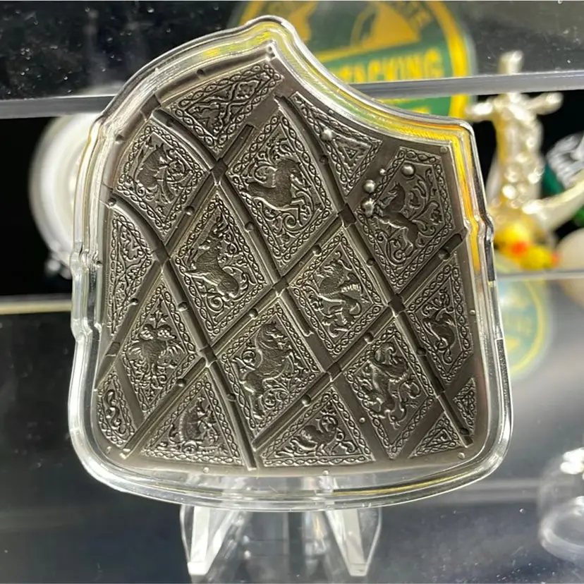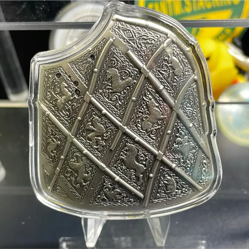These stackers are part of a series that features various legendary shields throughout history. Previous releases included the Shield of Achilles, the Shield of St. Michael the Archangel, and the Shield of Henry II of France. All these releases have been crafted with impressive attention to detail and have been available in both 2 oz and 1 kilo editions. The obverse and reverse of these Shield Trellised Targe Silver Stackers contain the same design. The obverse is convex, while the reverse is concaved to allow multiple pieces to fit neatly into place when stacked. The design itself contains trellised bands cutting across the shield diagonally in both directions. This forms individual diamond-shaped segments, each of which contains a real fantastic beast. If you look closely, you can make out a lion, horse, griffin, and to-headed eagle. You will also find small dent marks where a jousting stick would have struck the shield.