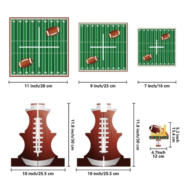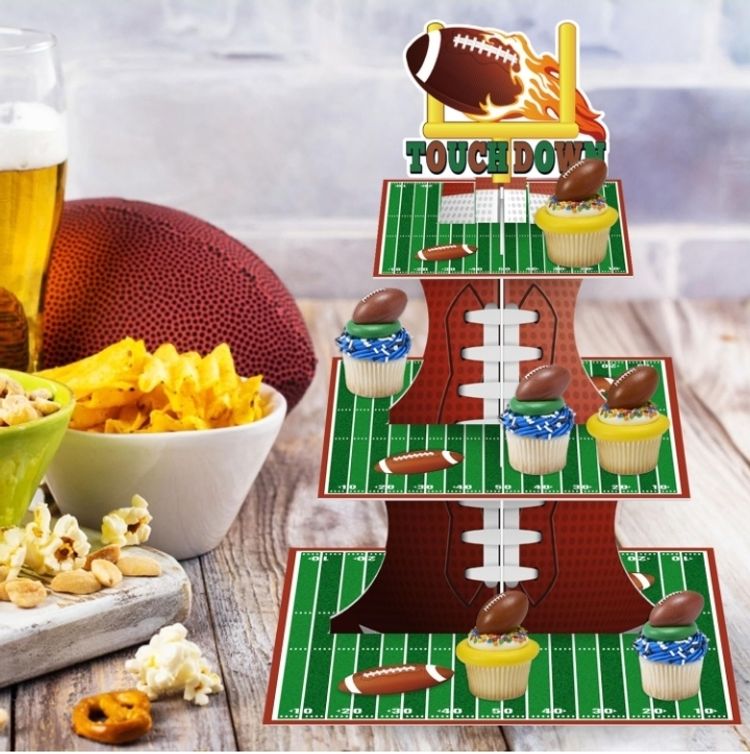 Suitable Size: this football party cupcake stand is about 11.8 inches high, the diameters of the 3 layers of cardboard are about 28 cm/ 11inches, 23 cm/ 9 inches and 18 cm/ 7 inches, the height between the two layers is high enough to allow you to place multiple cupcakes on each layer, both decorative and functional, suitable for parties