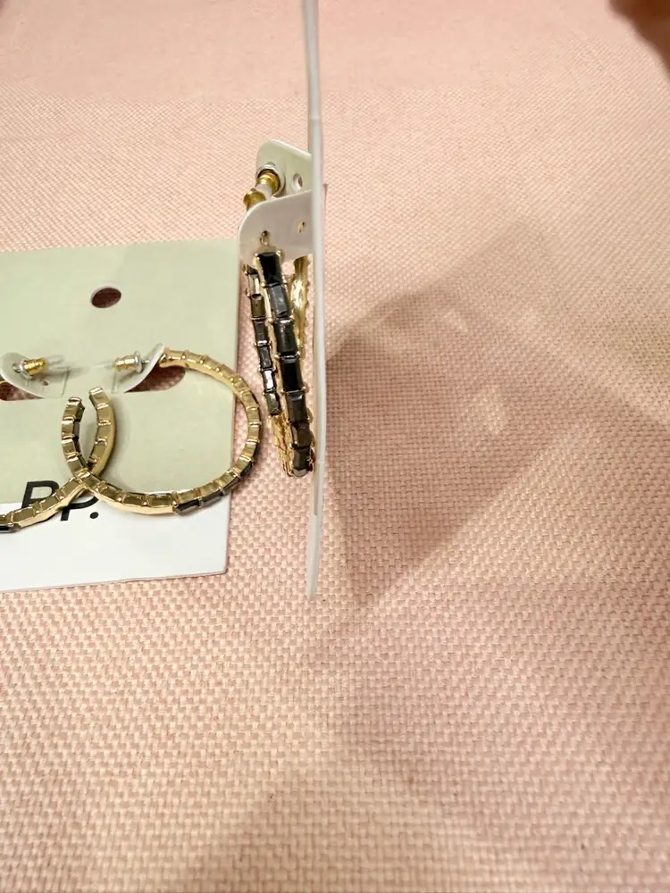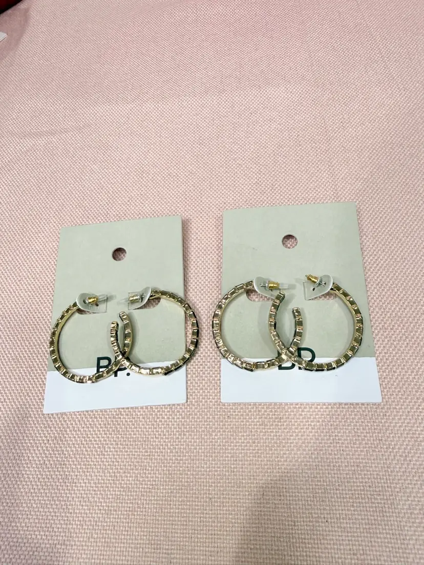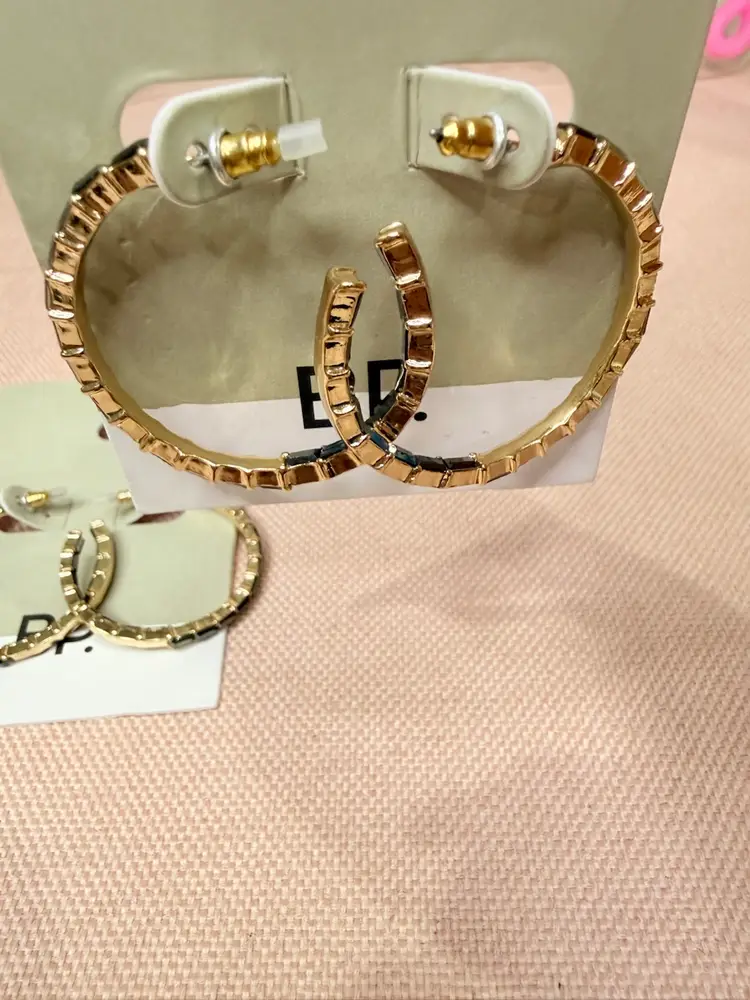 Keywords: gold hoop earrings, Nordstrom BP, black rhinestones, casual earrings, versatile jewelry, gold-tone, hoop wire closure, elegant accessories, new with tags, 2-pair bundle.