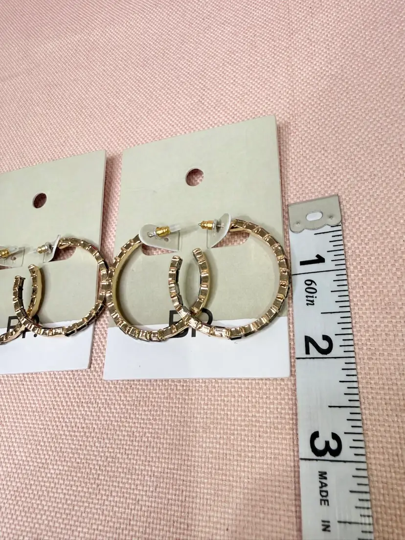 Elevate your style with this exquisite 2-pair lot bundle of Nordstrom BP gold hoop earrings, adorned with simulated black rhinestones CZ These versatile earrings, featuring a chic gold-tone finish, are perfect for adding a touch of elegance to any casual outing or special occasion. The hoop wire closure ensures a secure fit, making them a reliable choice for everyday wear or a night out. Whether you're dressing up for a brunch or a dinner date, these earrings are your go-to accessory. New with tags.